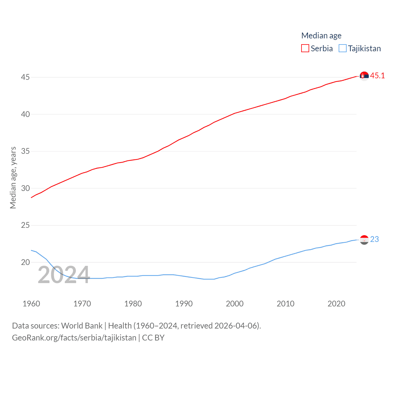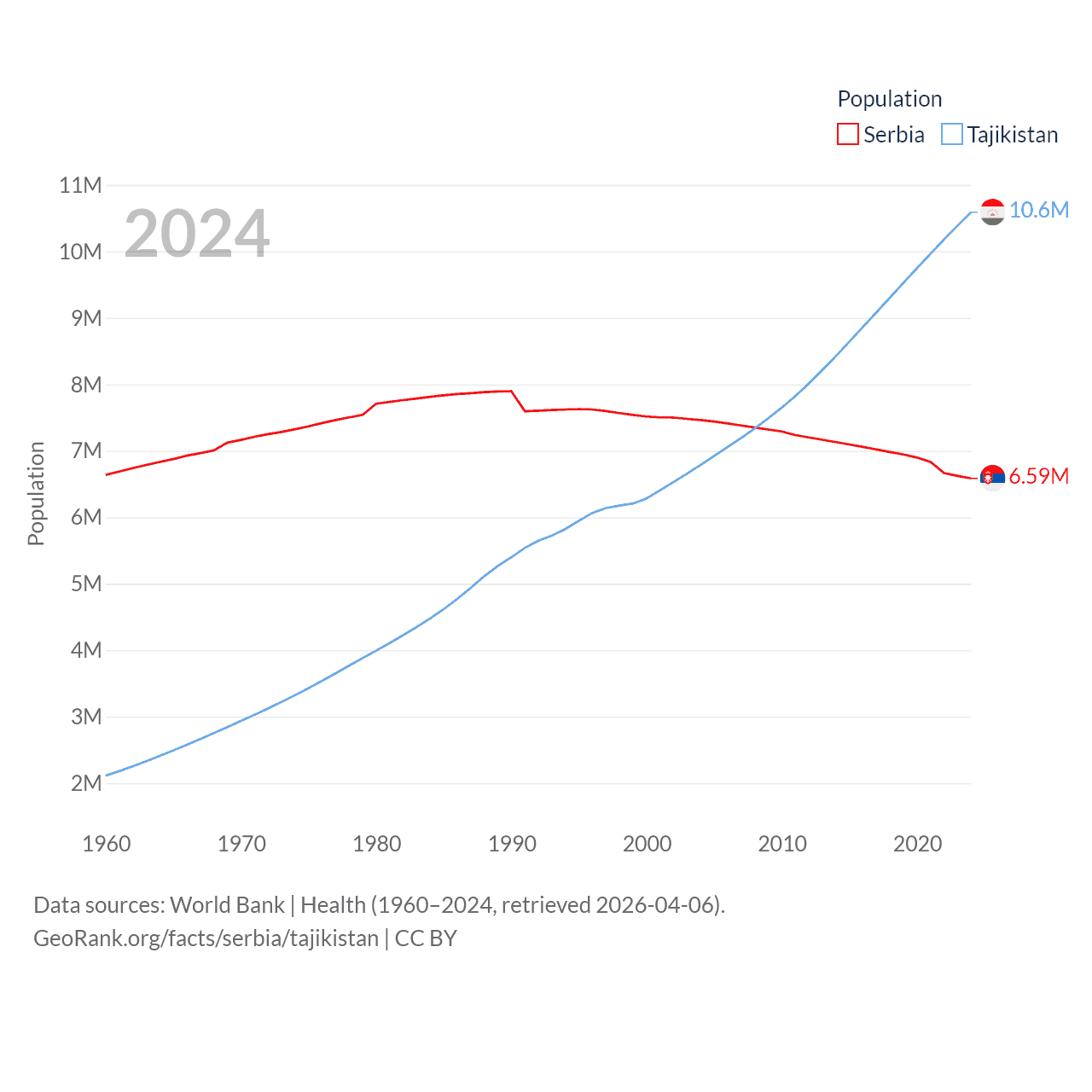 Serbia has a population of 6.59M (ranked 109/197), compared with 10.6M in Tajikistan (ranked 91/197). Serbia's land area is 32,467 sq mi versus 53,587 sq mi for Tajikistan (ranked 111th vs. 93rd).