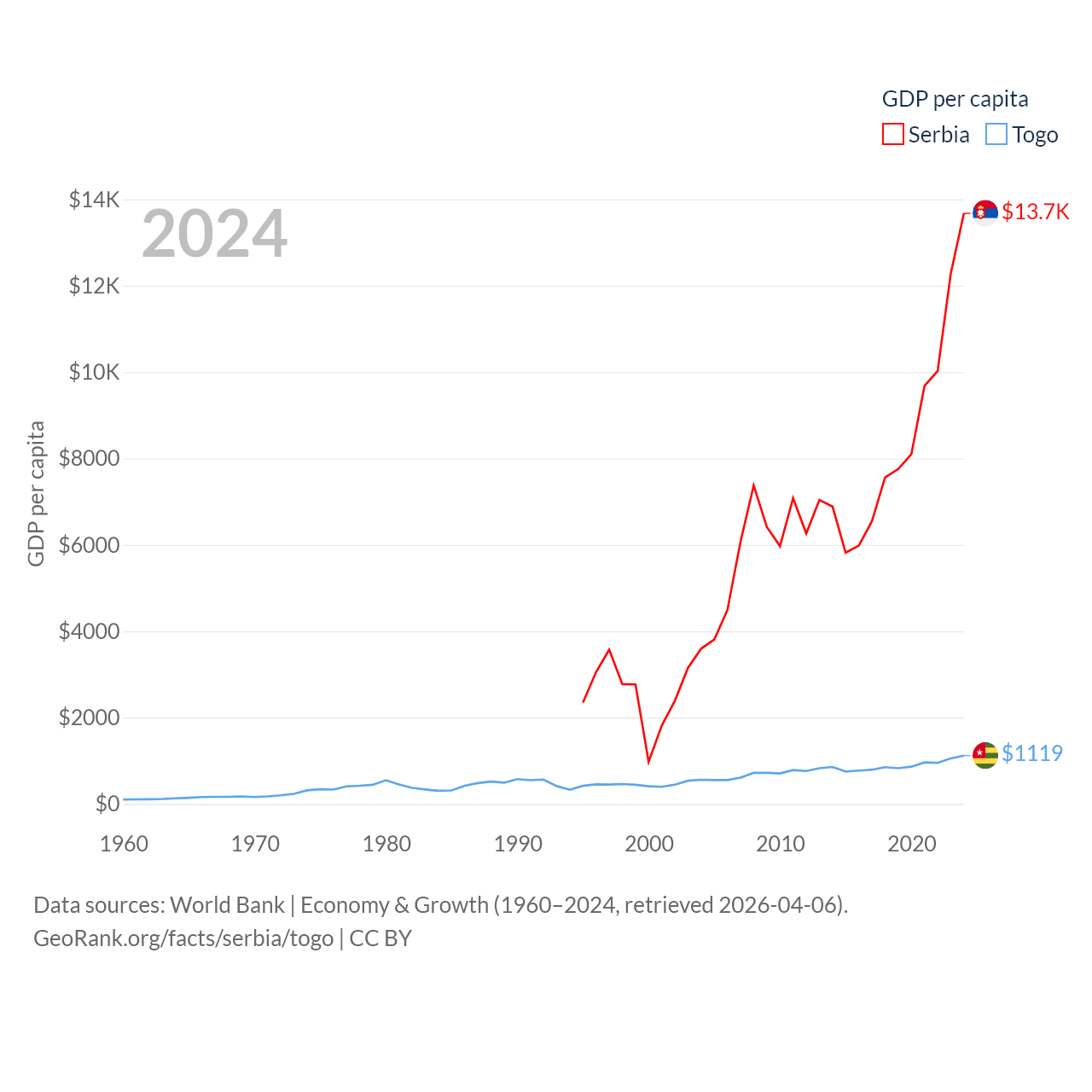 By GDP, Serbia ranks 76/197 ($90.1B) and Togo ranks 154/197 ($10.7B). By GDP per capita, Serbia ranks 73/197 ($13,679), while Togo ranks 172/197 ($1,119).
