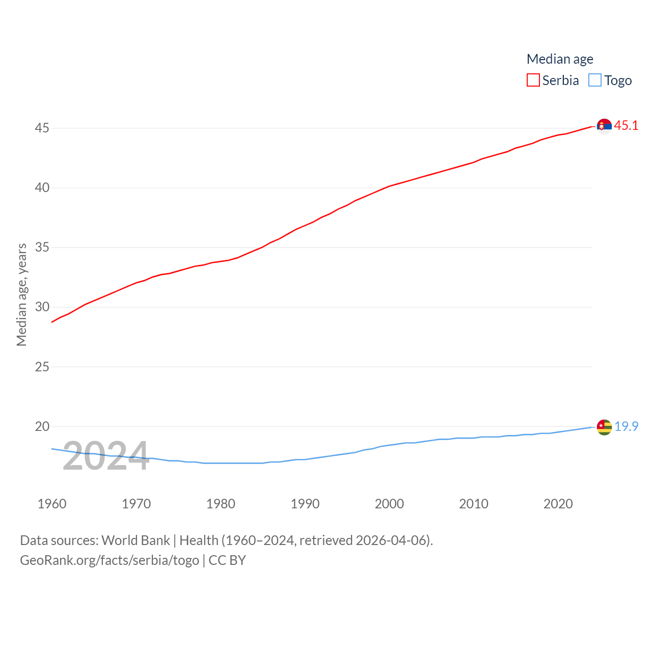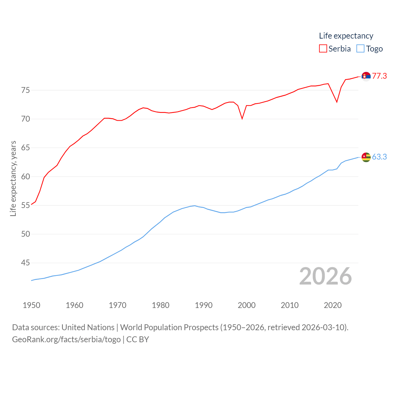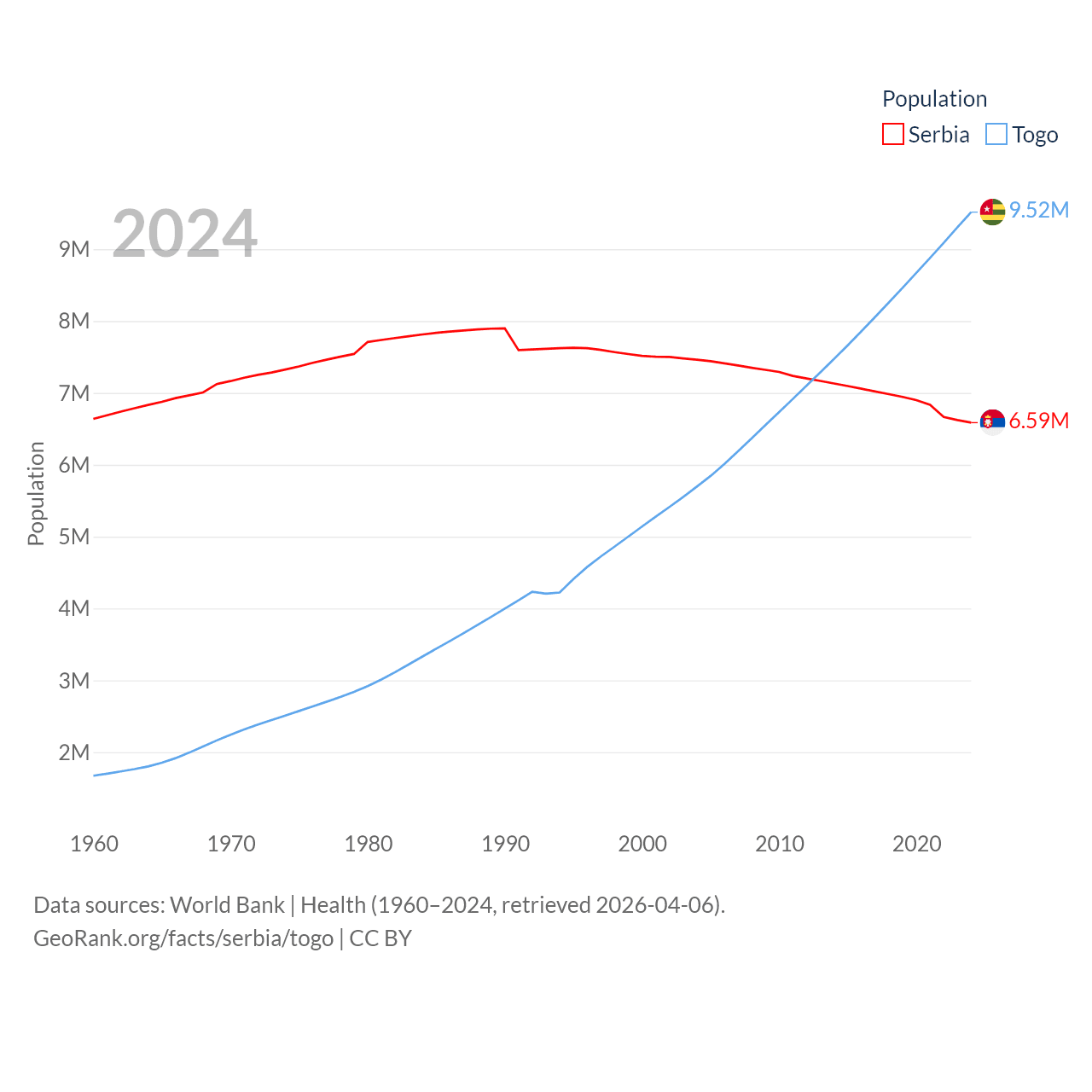 Serbia has a population of 6.59M (ranked 109/197), compared with 9.52M in Togo (ranked 98/197). Serbia's land area is 32,467 sq mi versus 21,000 sq mi for Togo (ranked 111th vs. 124th).