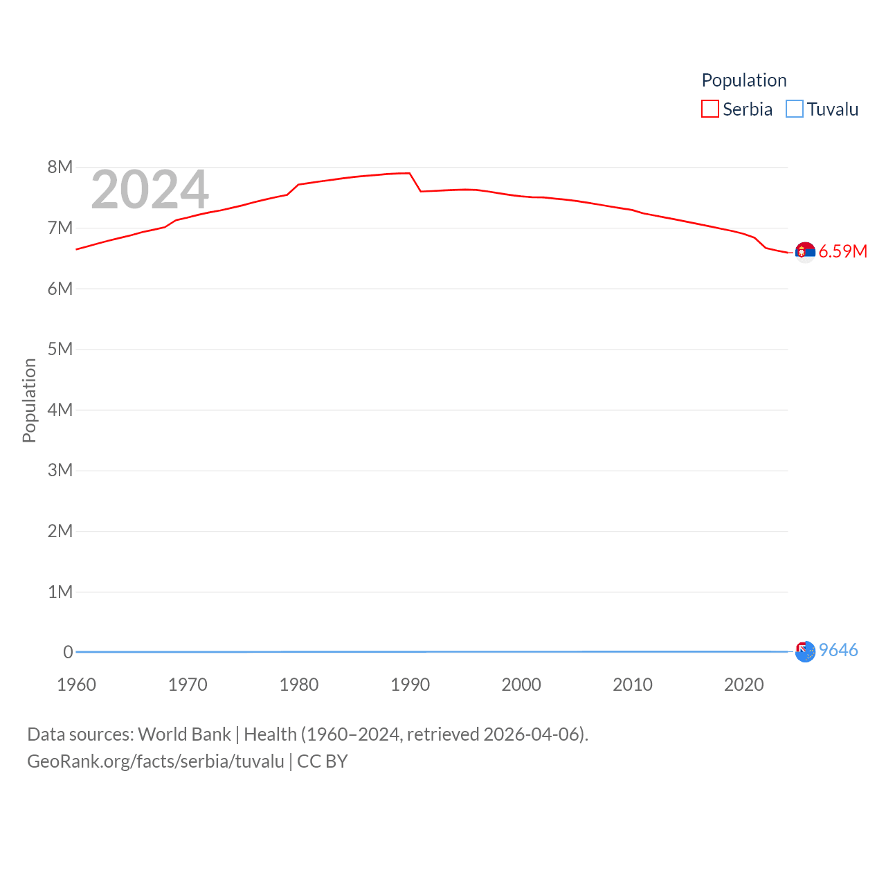 Serbia has a population of 6.59M (ranked 109/197), compared with 9.65K in Tuvalu (ranked 196/197). Serbia's land area is 32,467 sq mi versus 11.6 sq mi for Tuvalu (ranked 111th vs. 194th).