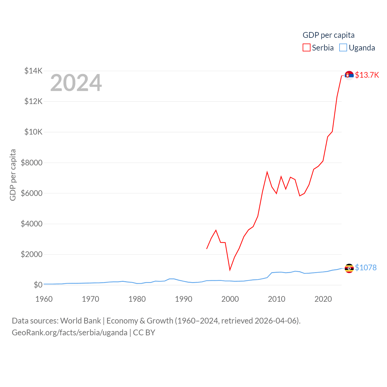 By GDP, Serbia ranks 76/197 ($90.1B) and Uganda ranks 89/197 ($53.9B). By GDP per capita, Serbia ranks 73/197 ($13,679), while Uganda ranks 176/197 ($1,078).
