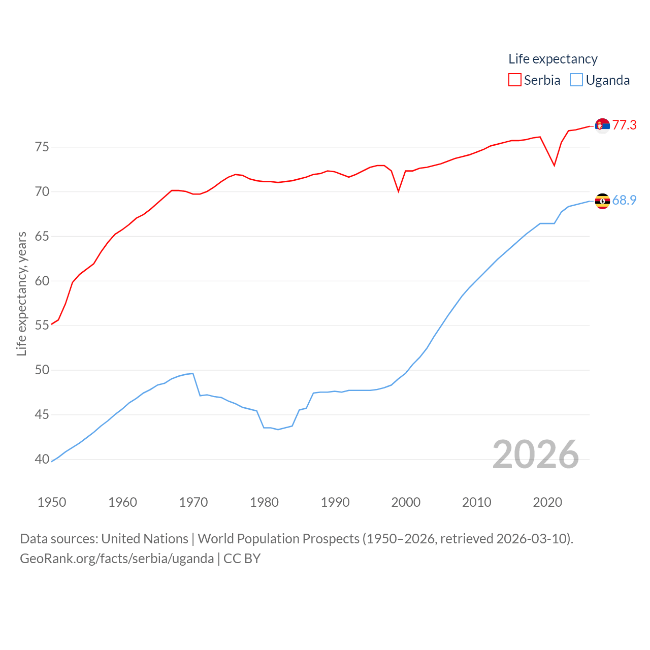 Serbia has a population of 6.59M (ranked 109/197), compared with 50M in Uganda (ranked 31/197). Serbia's land area is 32,467 sq mi versus 77,421 sq mi for Uganda (ranked 111th vs. 84th).