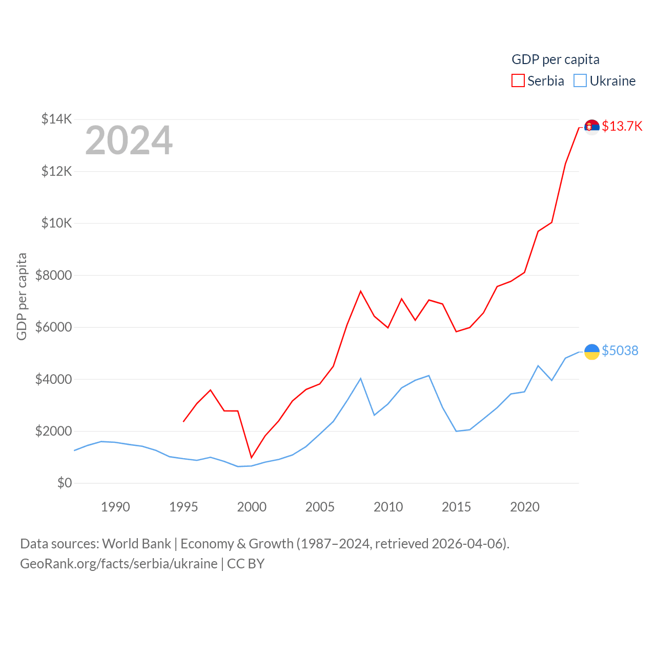 By GDP, Serbia ranks 76/197 ($90.1B) and Ukraine ranks 57/197 ($191B). By GDP per capita, Serbia ranks 73/197 ($13,679), while Ukraine ranks 120/197 ($5,038).
