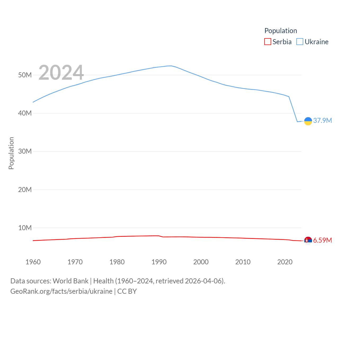 Serbia has a population of 6.59M (ranked 109/197), compared with 37.9M in Ukraine (ranked 41/197). Serbia's land area is 32,467 sq mi versus 223,708 sq mi for Ukraine (ranked 111th vs. 46th).
