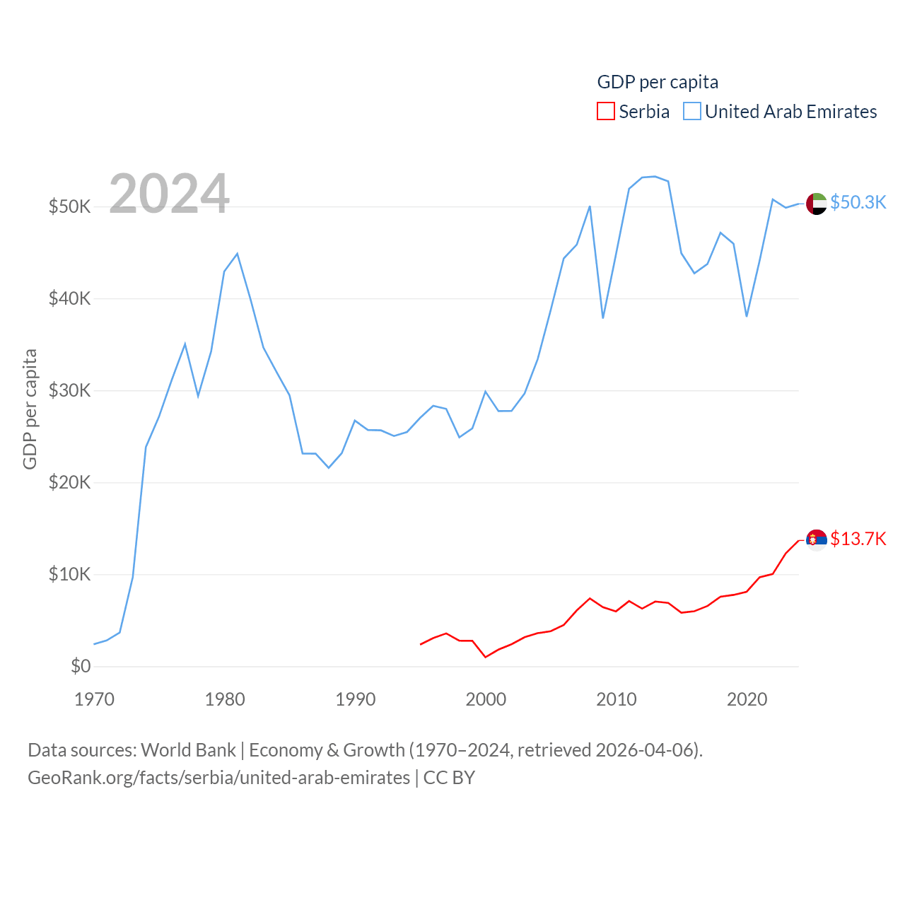 By GDP, Serbia ranks 76/197 ($90.1B) and The United Arab Emirates ranks 27/197 ($552B). By GDP per capita, Serbia ranks 73/197 ($13,679), while The United Arab Emirates ranks 24/197 ($50,274).