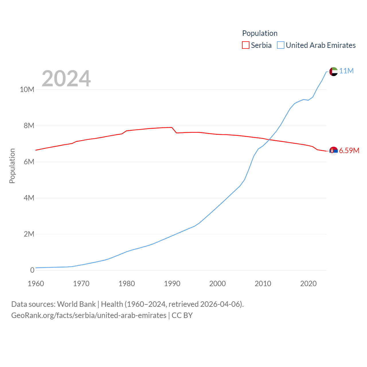 Serbia has a population of 6.59M (ranked 109/197), compared with 11M in The United Arab Emirates (ranked 86/197). Serbia's land area is 32,467 sq mi versus 27,421 sq mi for The United Arab Emirates (ranked 111th vs. 117th).