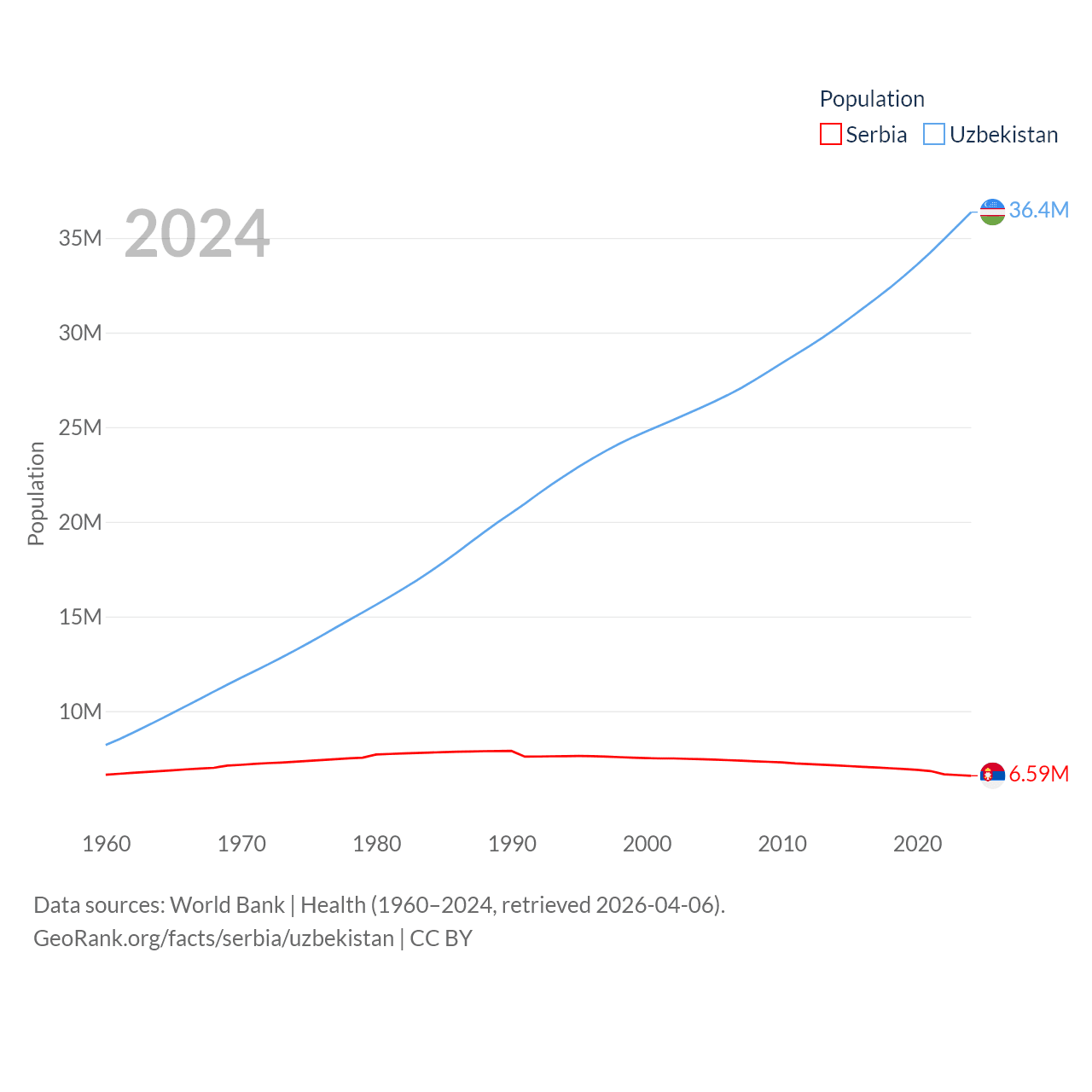 Serbia has a population of 6.59M (ranked 109/197), compared with 36.4M in Uzbekistan (ranked 43/197). Serbia's land area is 32,467 sq mi versus 170,136 sq mi for Uzbekistan (ranked 111th vs. 56th).