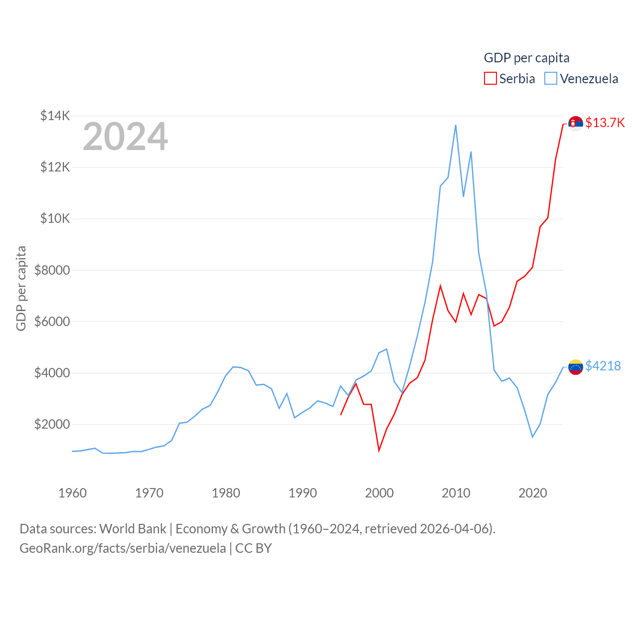 By GDP, Serbia ranks 76/197 ($90.1B) and Venezuela ranks 65/197 ($120B). By GDP per capita, Serbia ranks 73/197 ($13,679), while Venezuela ranks 128/197 ($4,218).