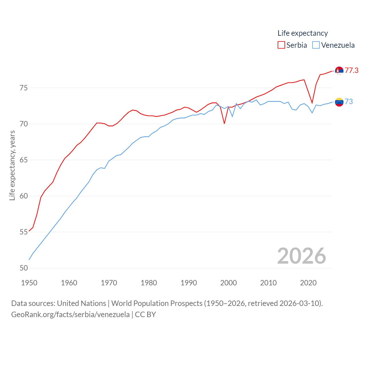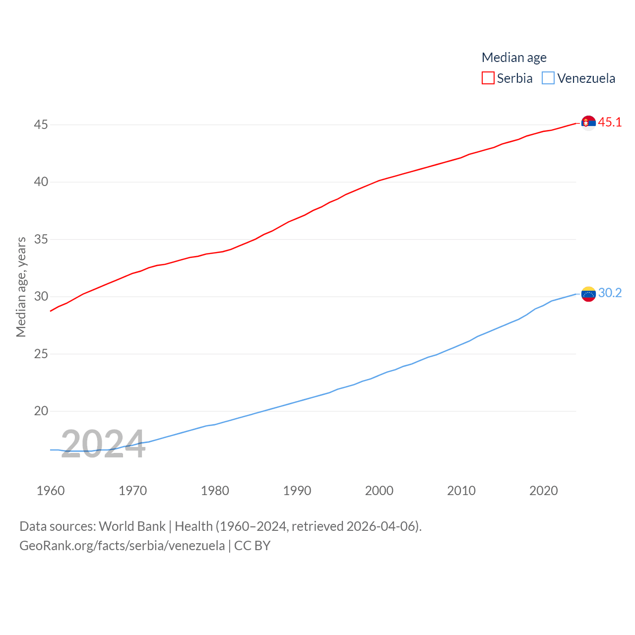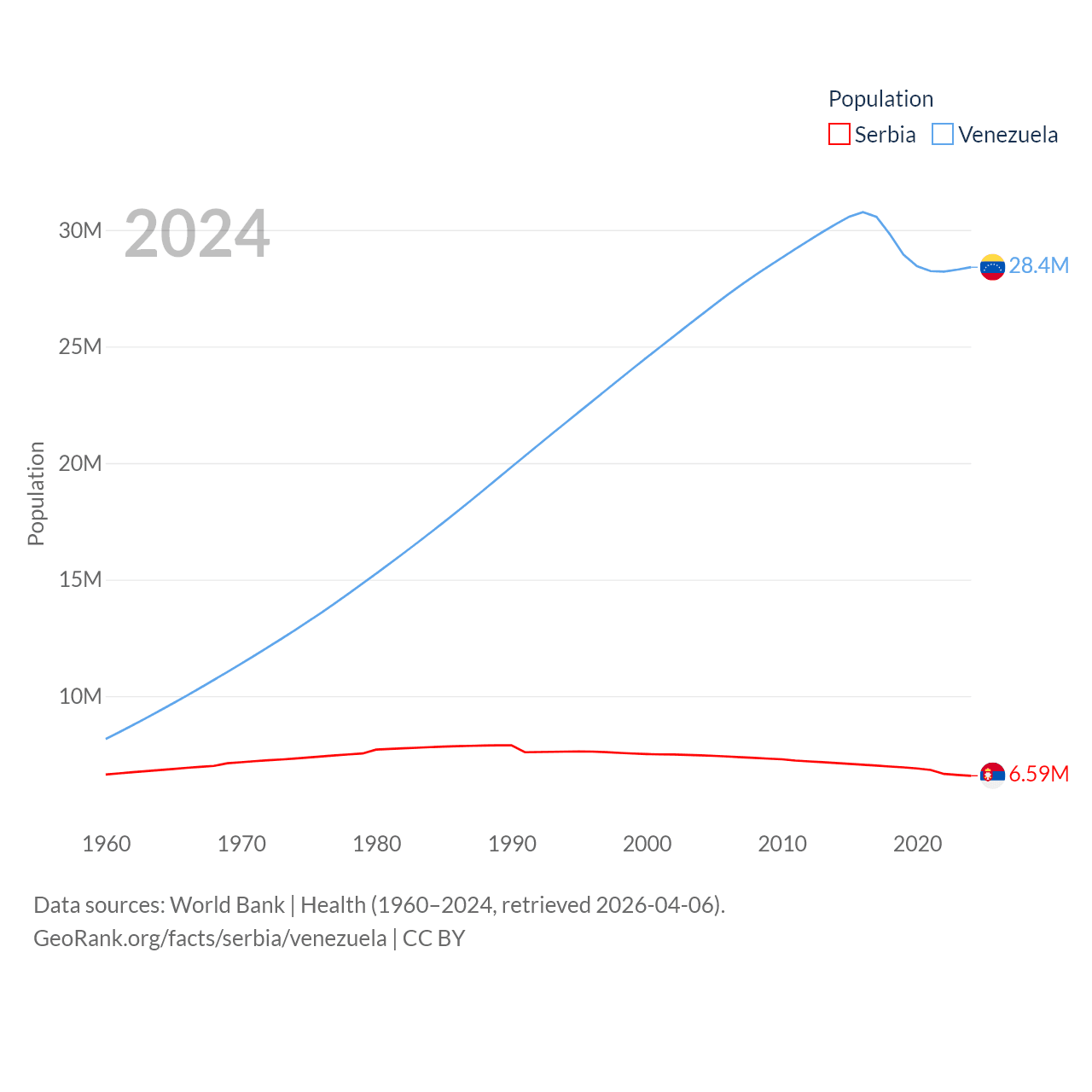 Serbia has a population of 6.59M (ranked 109/197), compared with 28.4M in Venezuela (ranked 53/197). Serbia's land area is 32,467 sq mi versus 340,561 sq mi for Venezuela (ranked 111th vs. 32nd).