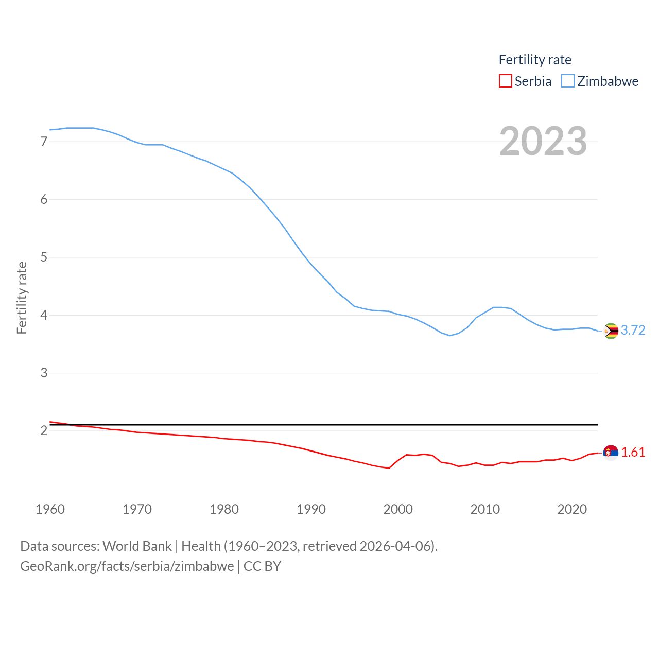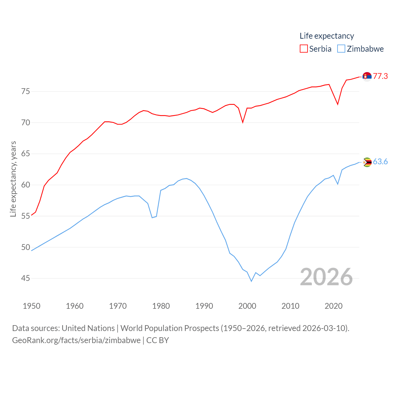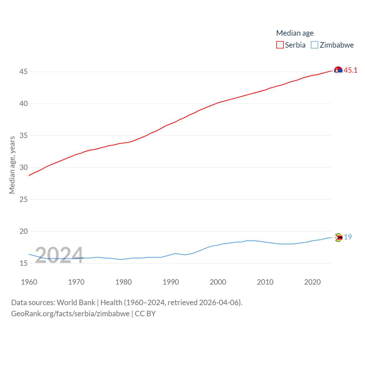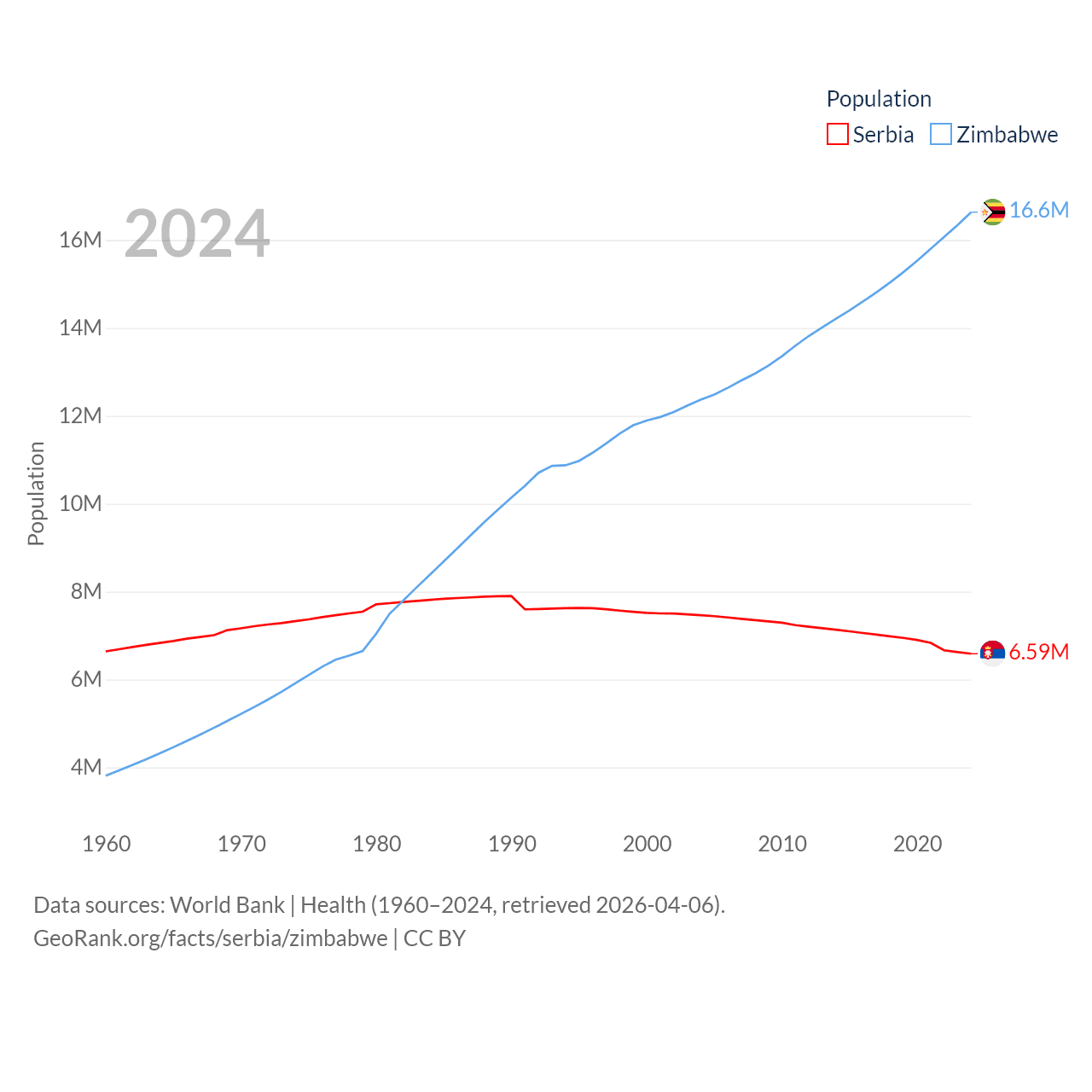 Serbia has a population of 6.59M (ranked 109/197), compared with 16.6M in Zimbabwe (ranked 74/197). Serbia's land area is 32,467 sq mi versus 149,364 sq mi for Zimbabwe (ranked 111th vs. 60th).