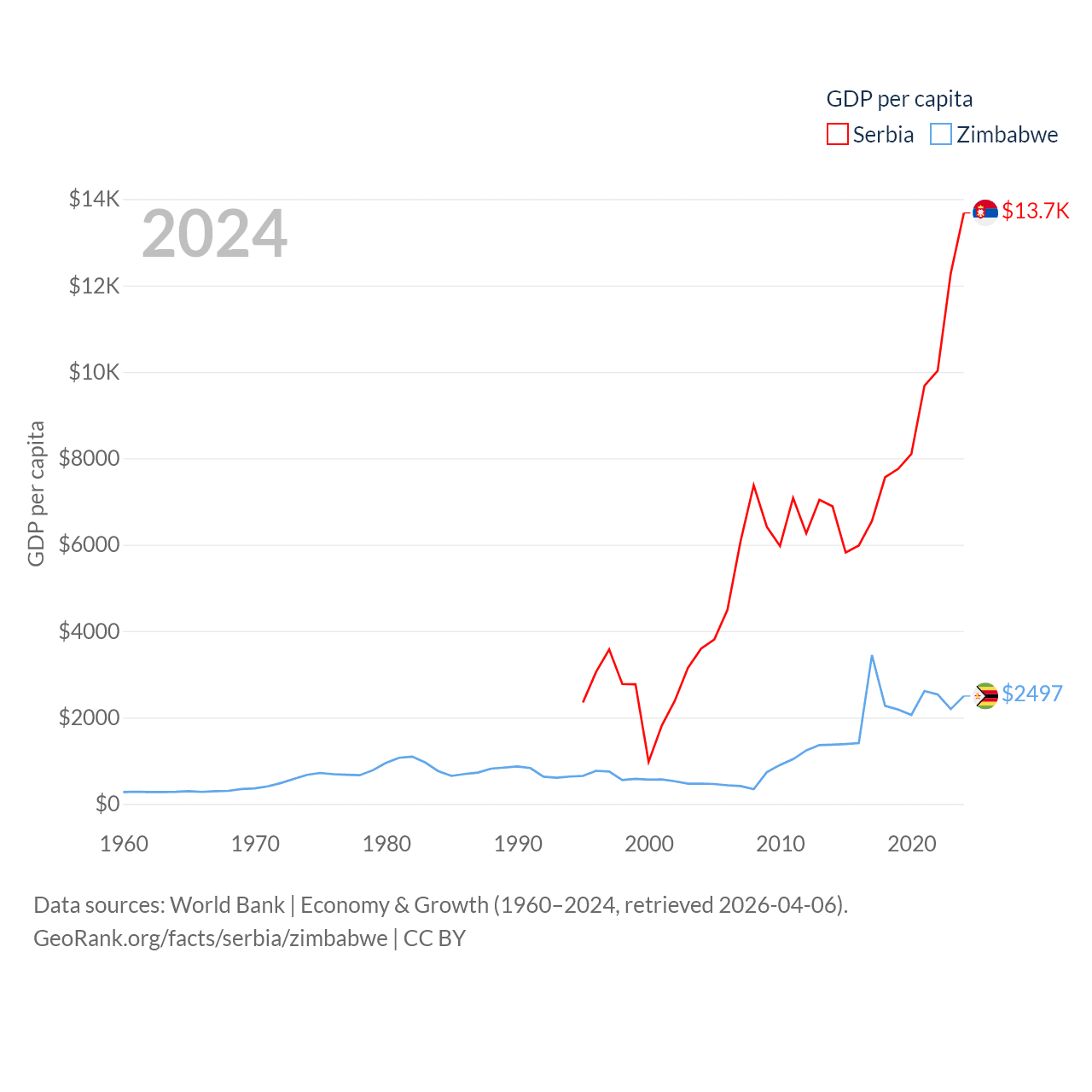 By GDP, Serbia ranks 76/197 ($90.1B) and Zimbabwe ranks 102/197 ($41.5B). By GDP per capita, Serbia ranks 73/197 ($13,679), while Zimbabwe ranks 148/197 ($2,497).