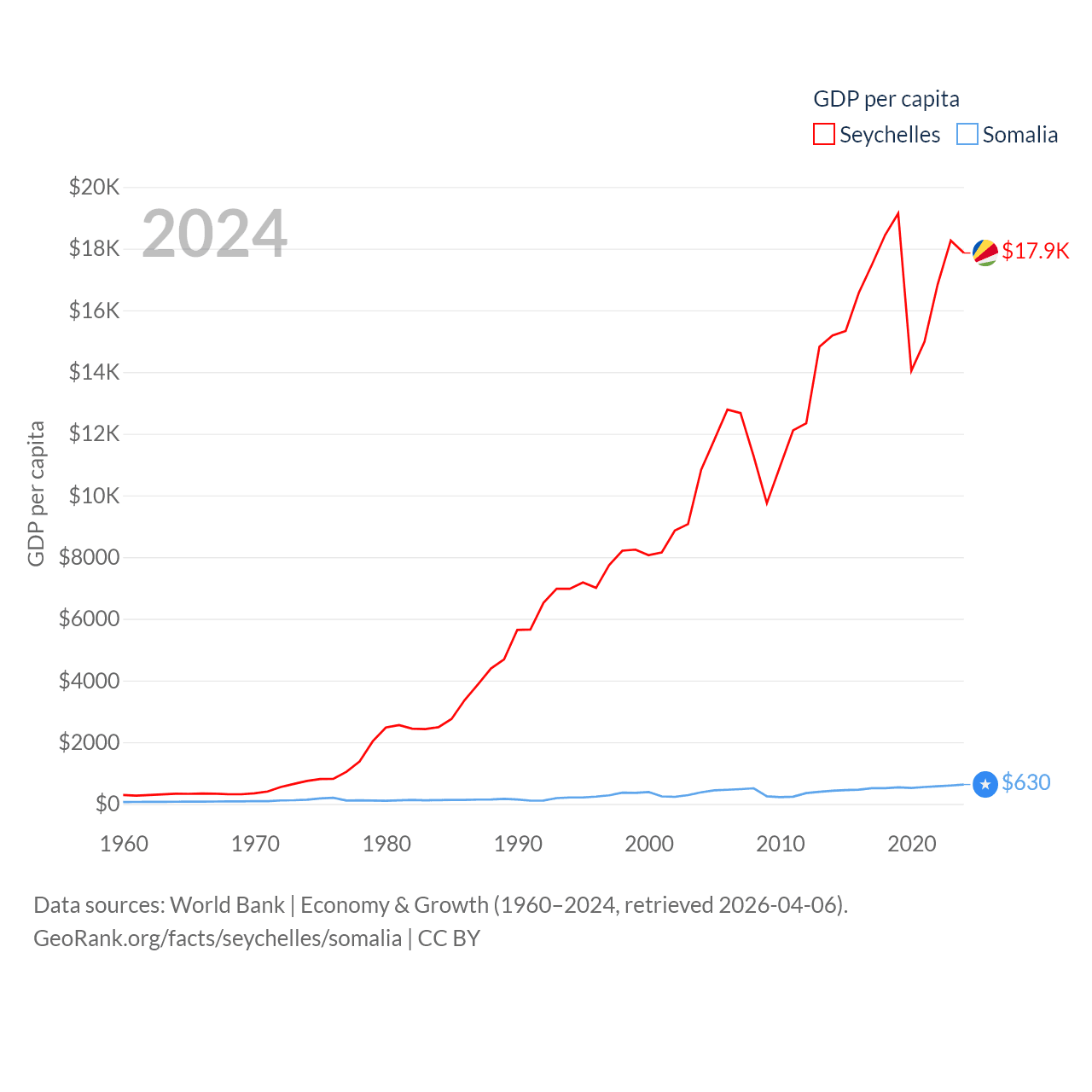 By GDP, The Seychelles ranks 178/197 ($2.17B) and Somalia ranks 150/197 ($12B). By GDP per capita, The Seychelles ranks 63/197 ($17,859), while Somalia ranks 192/197 ($630).