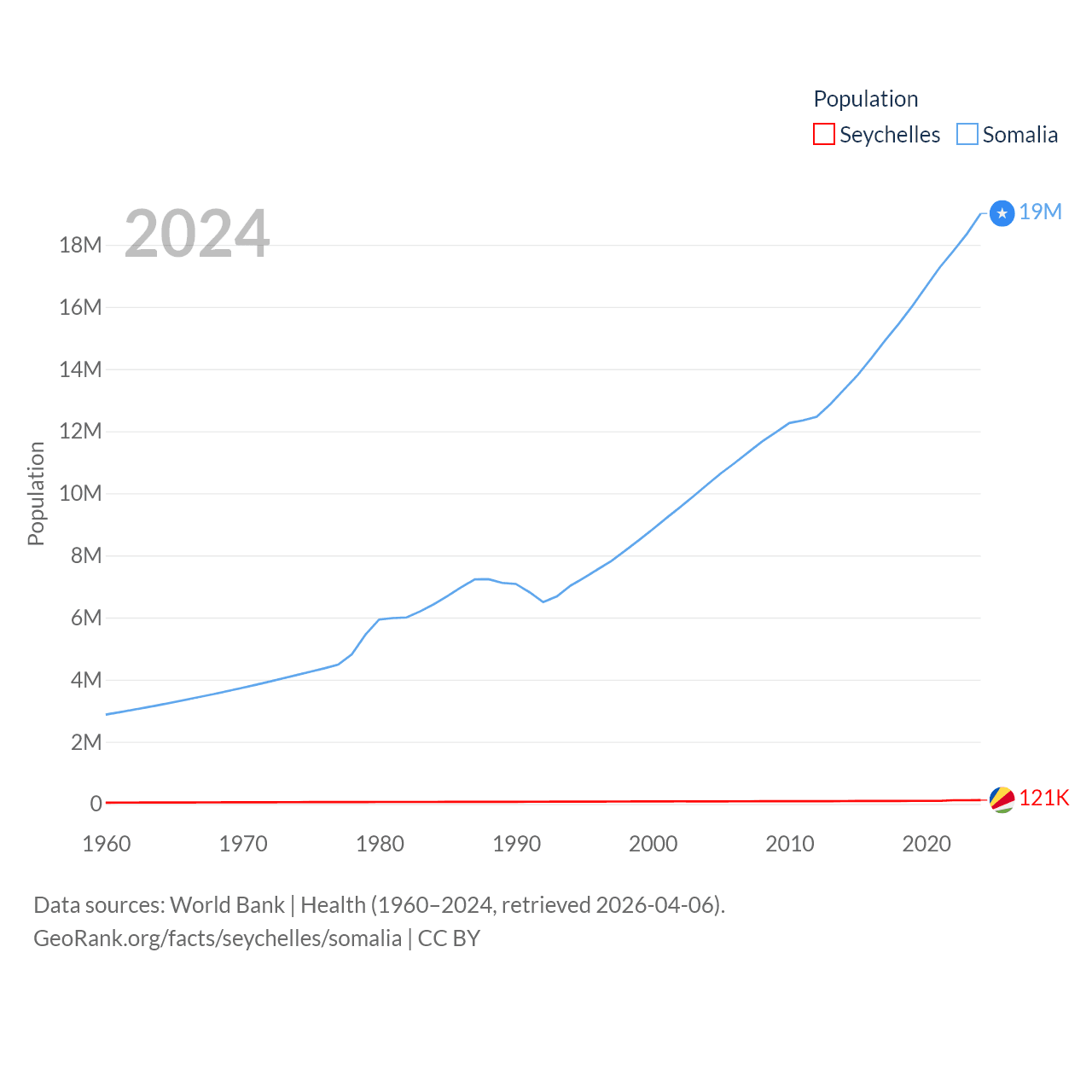 The Seychelles has a population of 121K (ranked 181/197), compared with 19M in Somalia (ranked 68/197). The Seychelles' land area is 177.6 sq mi versus 242,217 sq mi for Somalia (ranked 181st vs. 42nd).