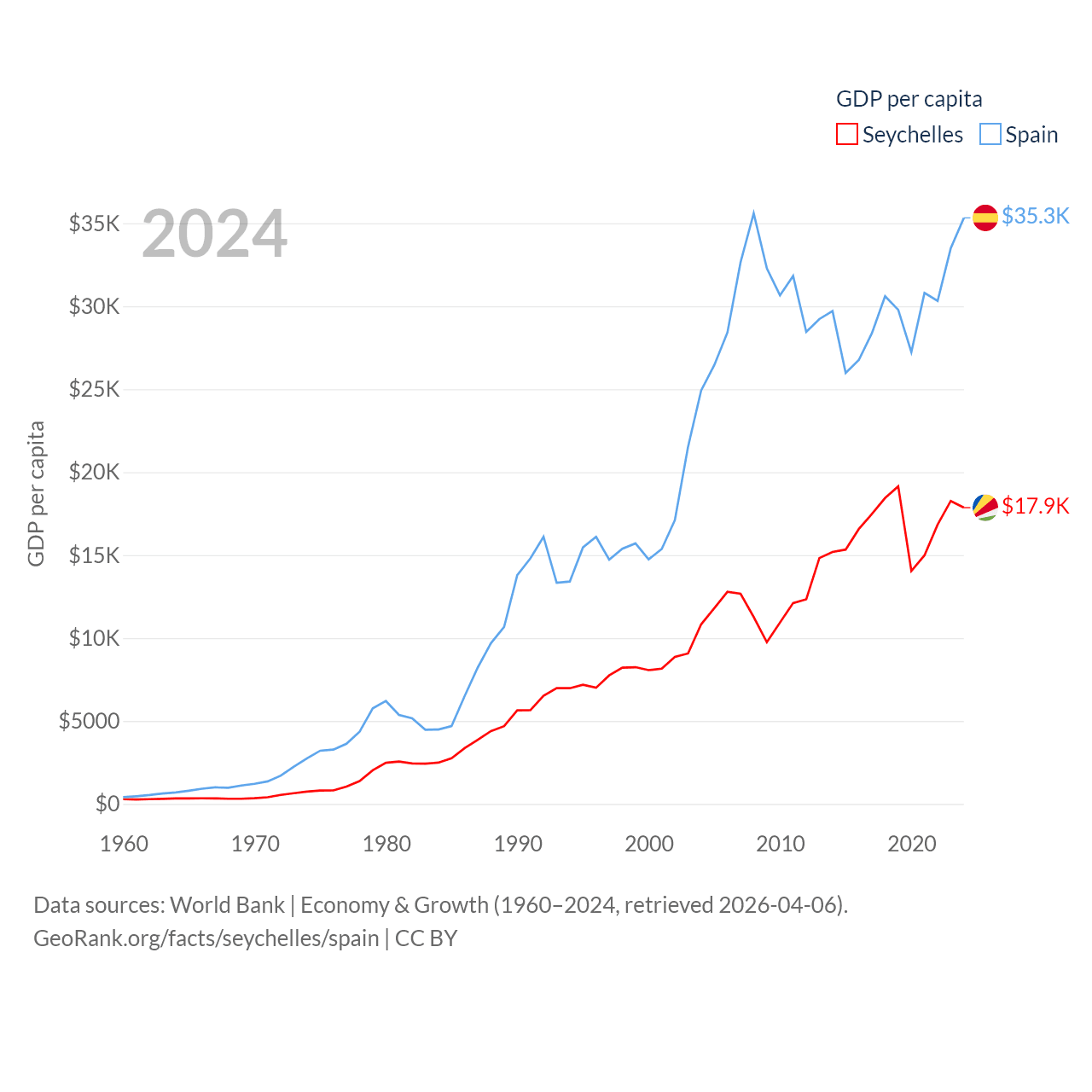 By GDP, The Seychelles ranks 178/197 ($2.17B) and Spain ranks 15/197 ($1.73T). By GDP per capita, The Seychelles ranks 63/197 ($17,859), while Spain ranks 32/197 ($35,327).