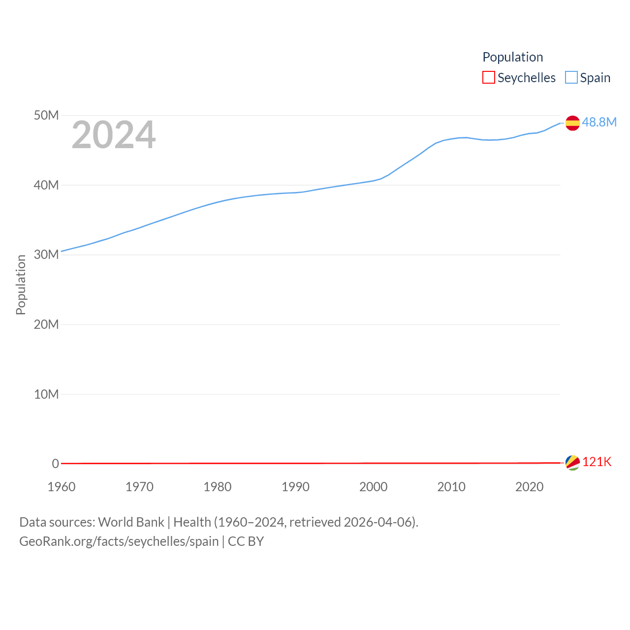 The Seychelles has a population of 121K (ranked 181/197), compared with 48.8M in Spain (ranked 32/197). The Seychelles' land area is 177.6 sq mi versus 192,934 sq mi for Spain (ranked 181st vs. 51st).