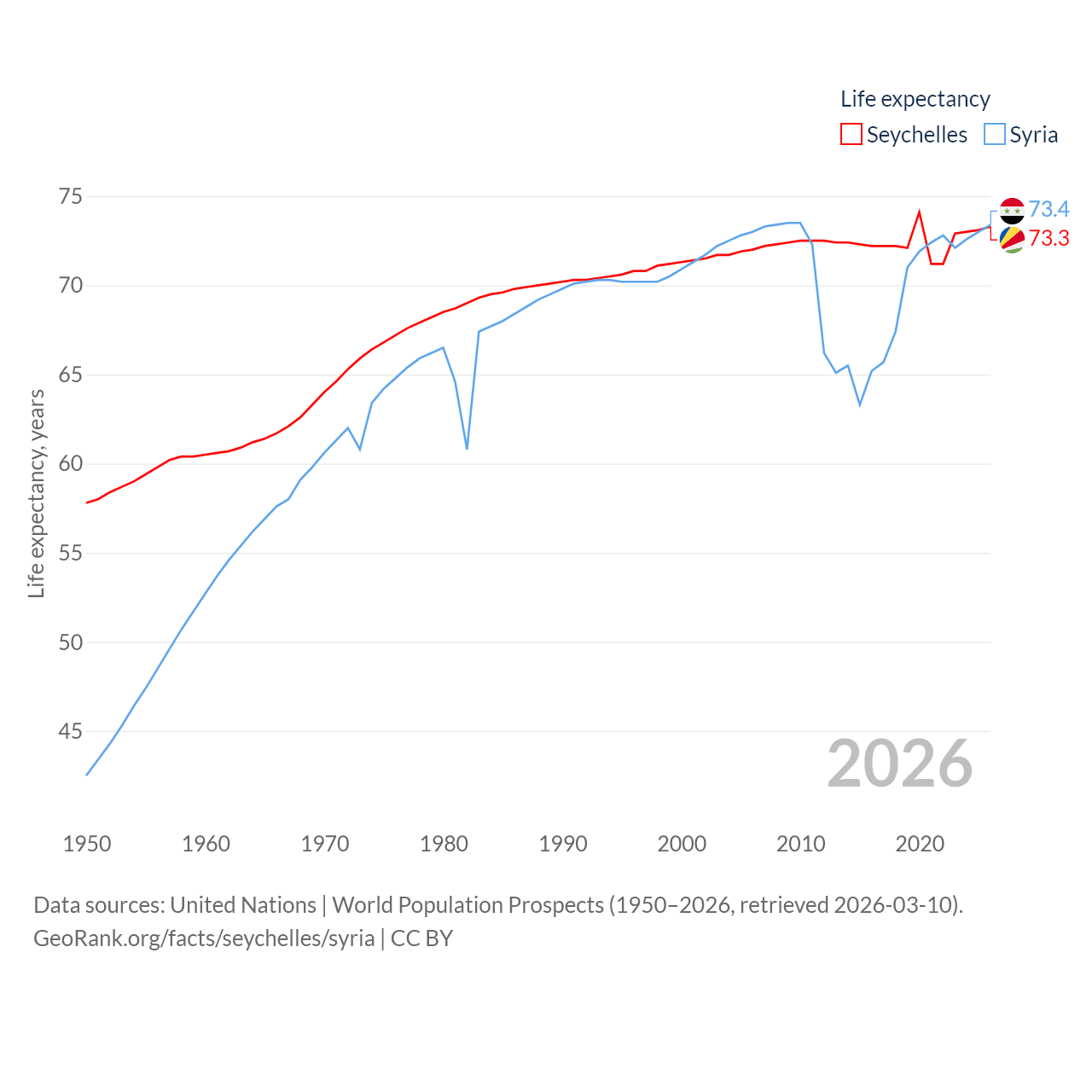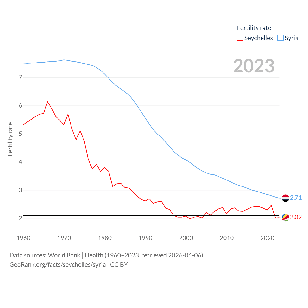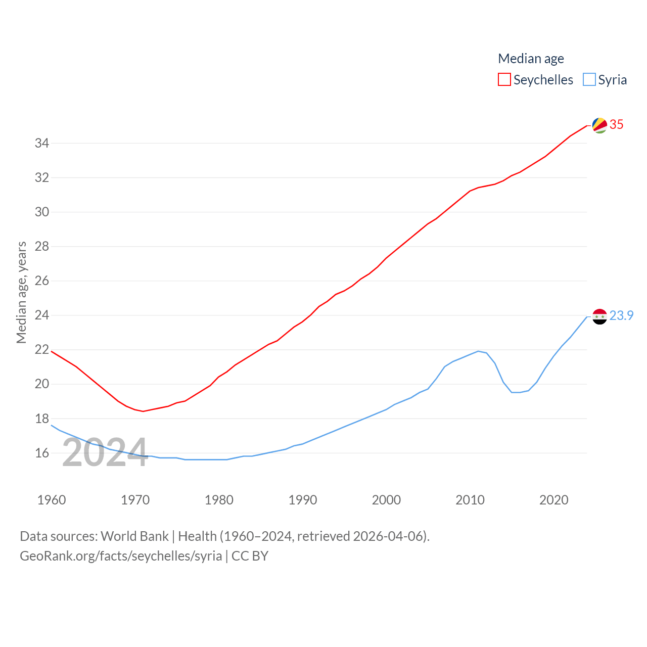The Seychelles has a population of 121K (ranked 181/197), compared with 24.7M in Syria (ranked 57/197). The Seychelles' land area is 177.6 sq mi versus 70,900 sq mi for Syria (ranked 181st vs. 87th).