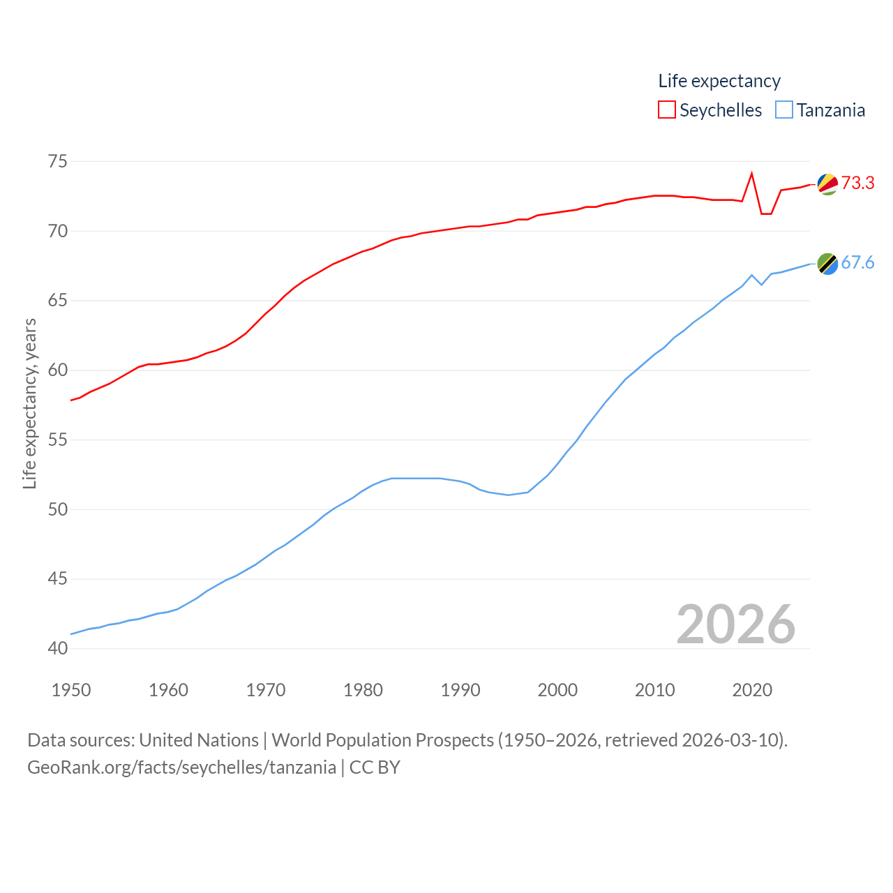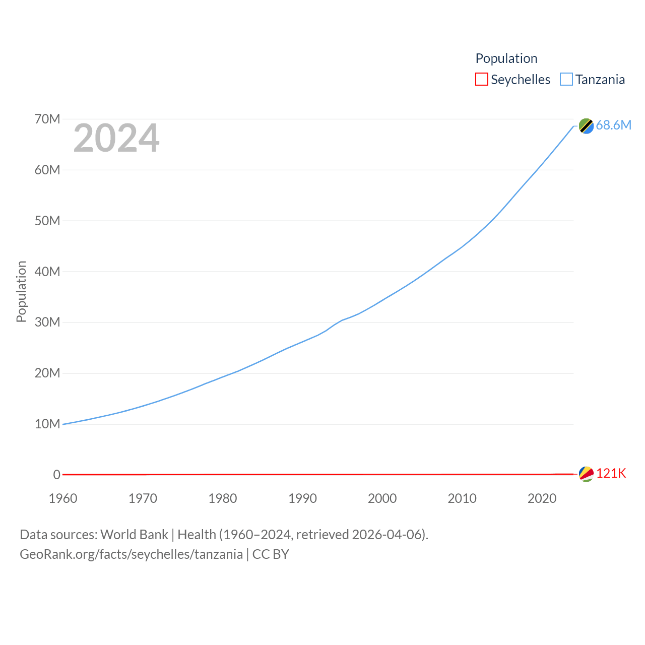 The Seychelles has a population of 121K (ranked 181/197), compared with 68.6M in Tanzania (ranked 22/197). The Seychelles' land area is 177.6 sq mi versus 342,009 sq mi for Tanzania (ranked 181st vs. 31st).