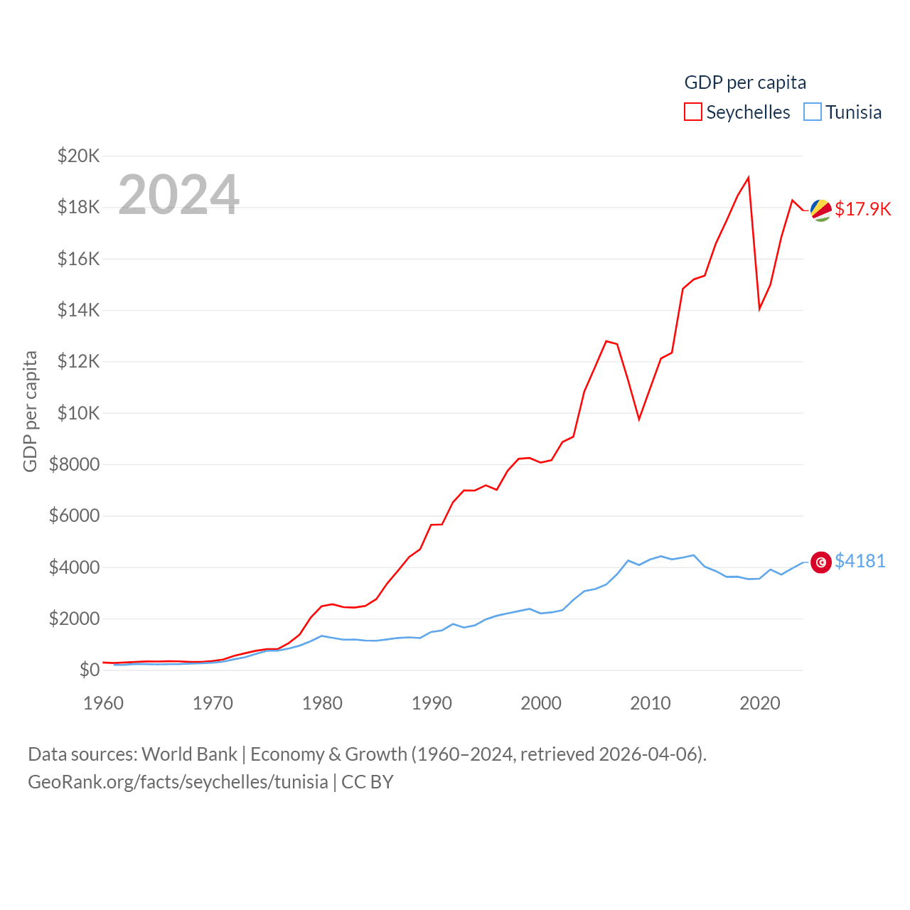By GDP, The Seychelles ranks 178/197 ($2.17B) and Tunisia ranks 93/197 ($51.3B). By GDP per capita, The Seychelles ranks 63/197 ($17,859), while Tunisia ranks 129/197 ($4,181).