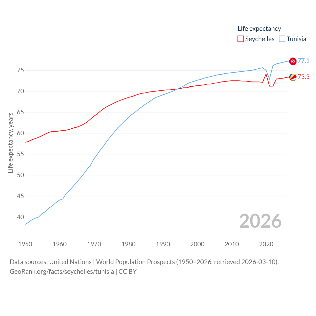 The Seychelles has a population of 121K (ranked 181/197), compared with 12.3M in Tunisia (ranked 80/197). The Seychelles' land area is 177.6 sq mi versus 59,985 sq mi for Tunisia (ranked 181st vs. 91st).