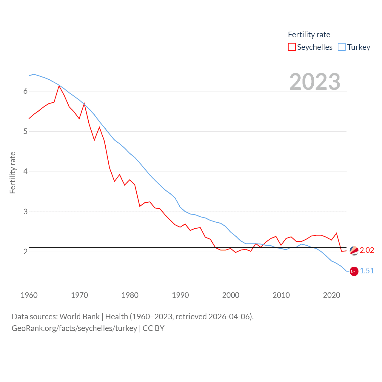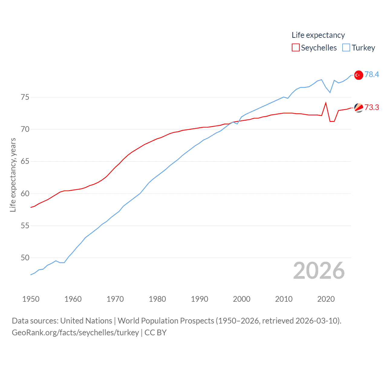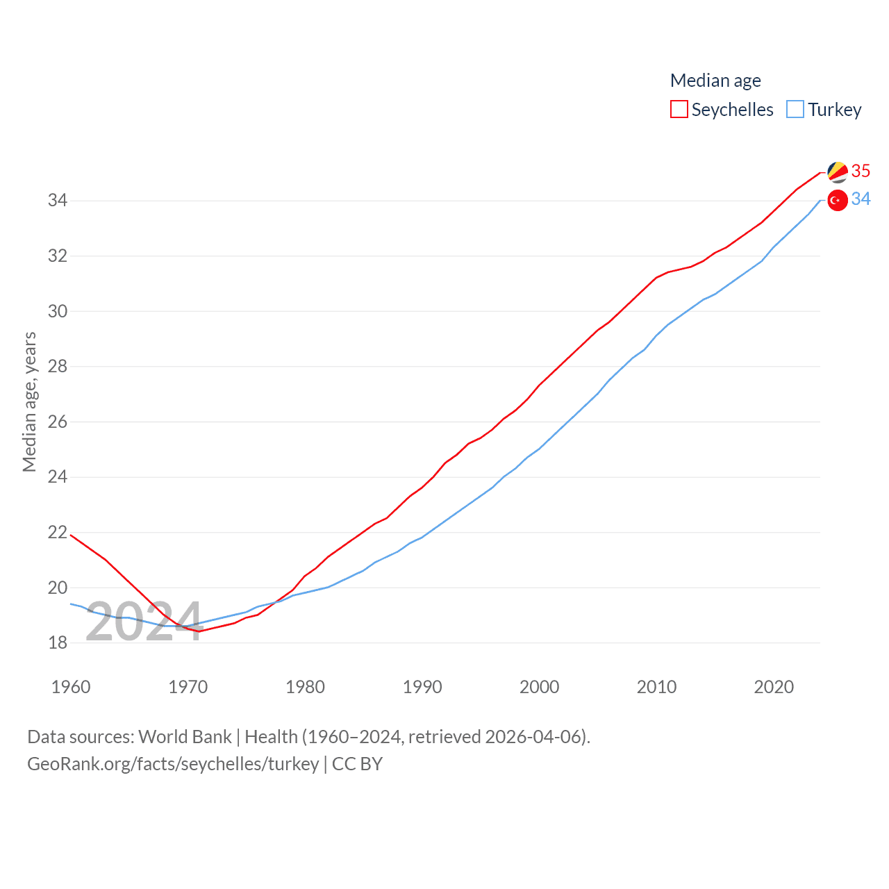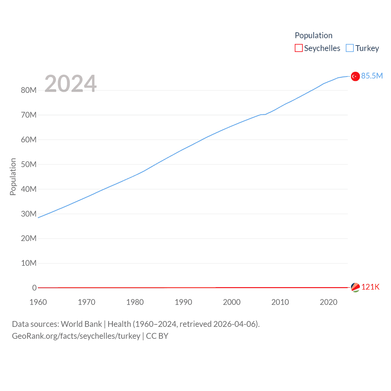 The Seychelles has a population of 121K (ranked 181/197), compared with 85.5M in Turkey (ranked 18/197). The Seychelles' land area is 177.6 sq mi versus 297,156 sq mi for Turkey (ranked 181st vs. 36th).