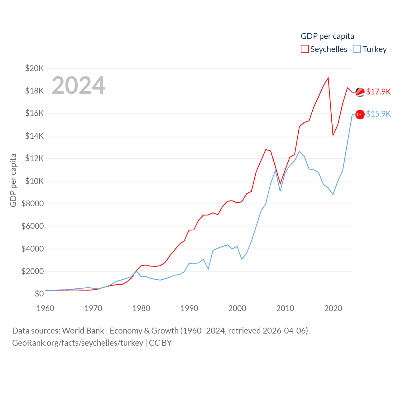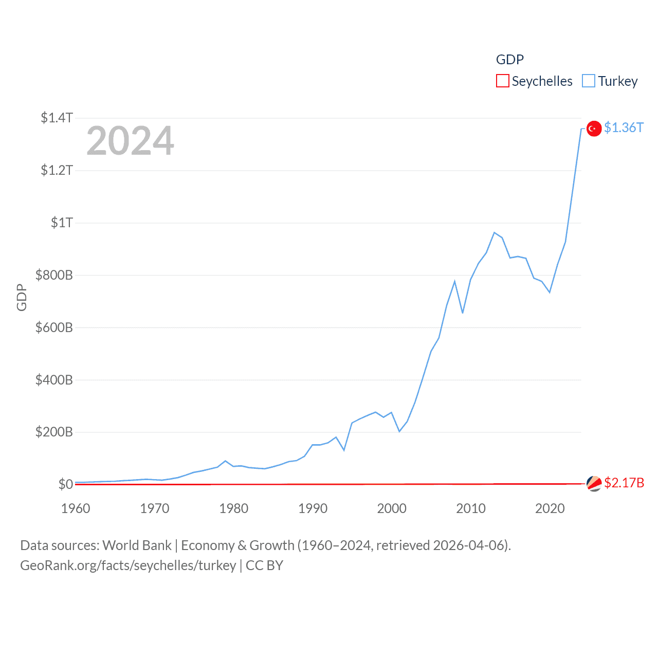 By GDP, The Seychelles ranks 178/197 ($2.17B) and Turkey ranks 17/197 ($1.36T). By GDP per capita, The Seychelles ranks 63/197 ($17,859), while Turkey ranks 66/197 ($15,893).