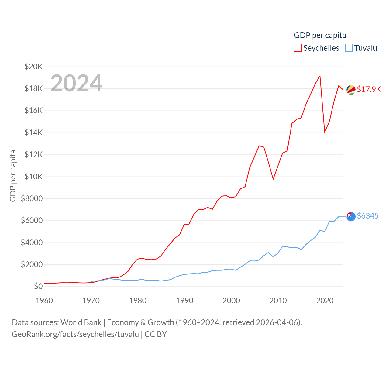 By GDP, The Seychelles ranks 178/197 ($2.17B) and Tuvalu ranks 196/197 ($62.3M). By GDP per capita, The Seychelles ranks 63/197 ($17,859), while Tuvalu ranks 110/197 ($6,345).