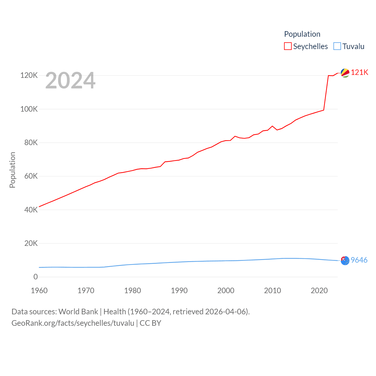 The Seychelles has a population of 121K (ranked 181/197), compared with 9.65K in Tuvalu (ranked 196/197). The Seychelles' land area is 177.6 sq mi versus 11.6 sq mi for Tuvalu (ranked 181st vs. 194th).