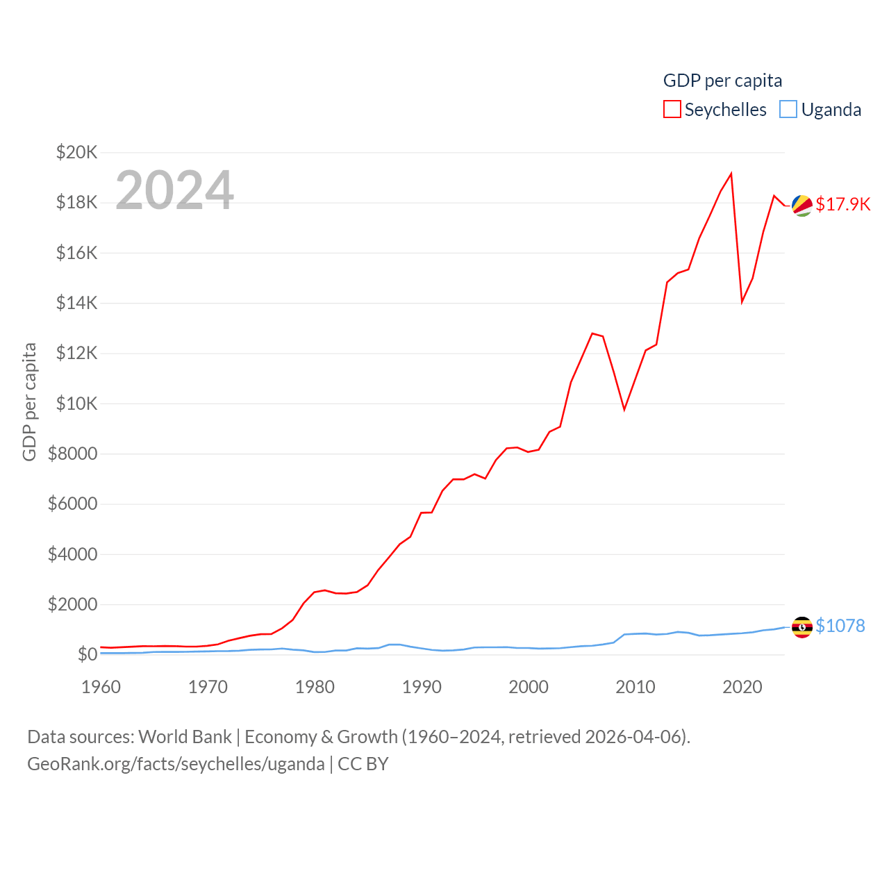By GDP, The Seychelles ranks 178/197 ($2.17B) and Uganda ranks 89/197 ($53.9B). By GDP per capita, The Seychelles ranks 63/197 ($17,859), while Uganda ranks 176/197 ($1,078).