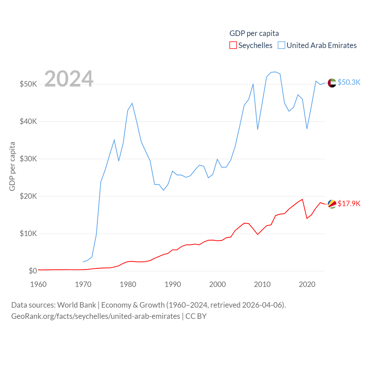 By GDP, The Seychelles ranks 178/197 ($2.17B) and The United Arab Emirates ranks 27/197 ($552B). By GDP per capita, The Seychelles ranks 63/197 ($17,859), while The United Arab Emirates ranks 24/197 ($50,274).