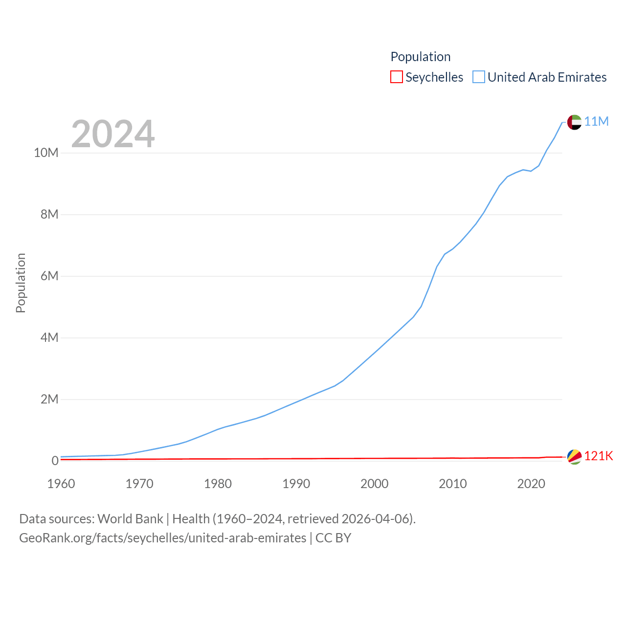 The Seychelles has a population of 121K (ranked 181/197), compared with 11M in The United Arab Emirates (ranked 86/197). The Seychelles' land area is 177.6 sq mi versus 27,421 sq mi for The United Arab Emirates (ranked 181st vs. 117th).