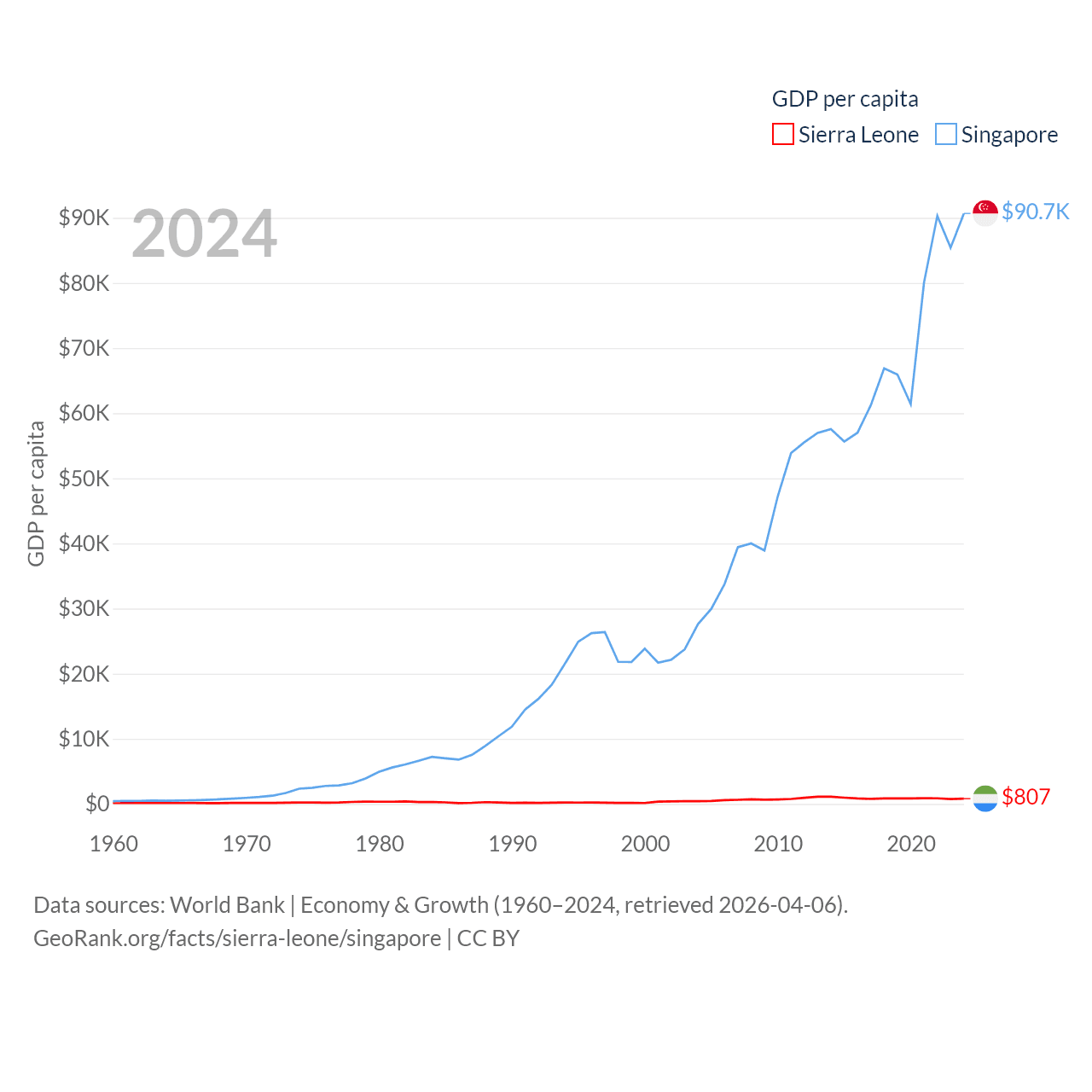 By GDP, Sierra Leone ranks 160/197 ($6.97B) and Singapore ranks 28/197 ($547B). By GDP per capita, Sierra Leone ranks 186/197 ($807), while Singapore ranks 7/197 ($90,674).