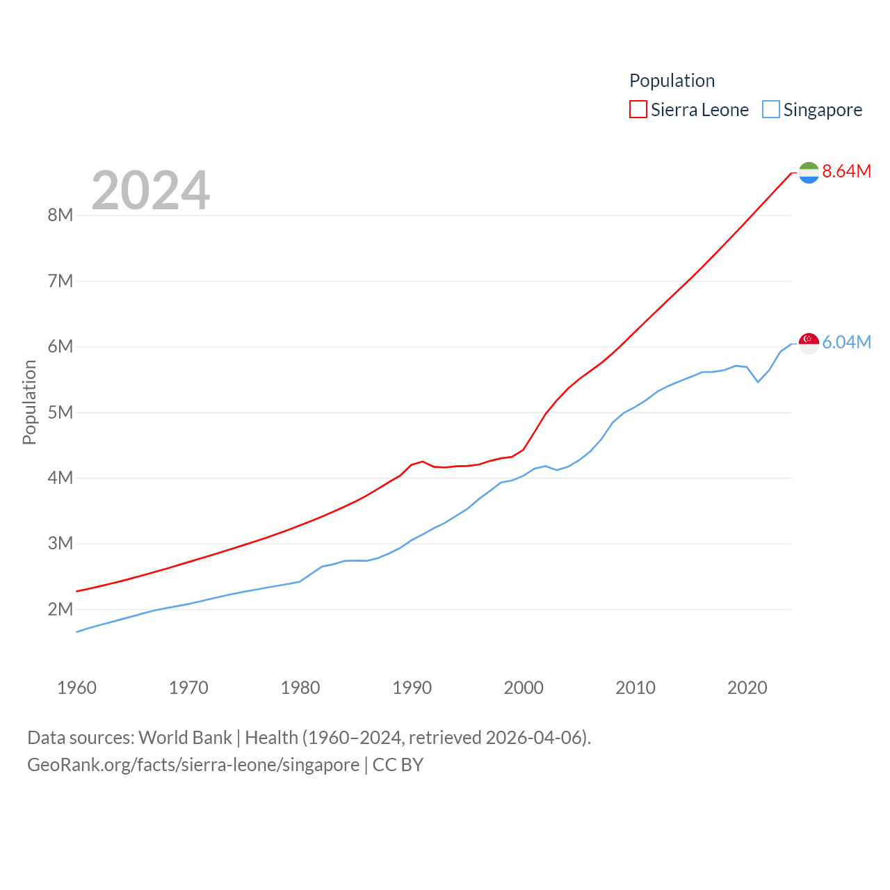 Sierra Leone has a population of 8.64M (ranked 102/197), compared with 6.04M in Singapore (ranked 113/197). Sierra Leone's land area is 27,869 sq mi versus 277.2 sq mi for Singapore (ranked 116th vs. 177th).