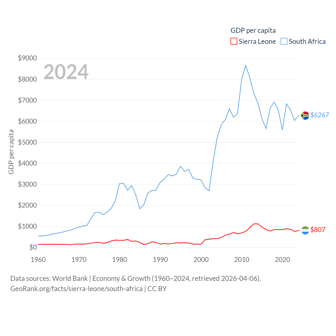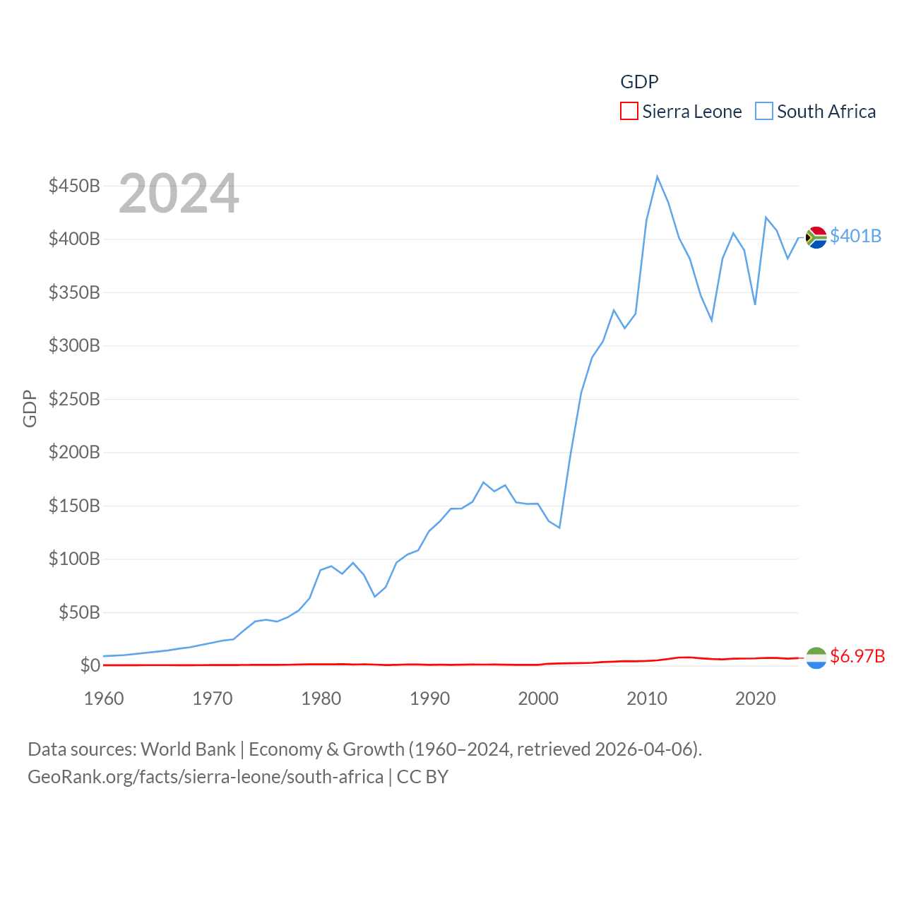 By GDP, Sierra Leone ranks 160/197 ($6.97B) and South Africa ranks 40/197 ($401B). By GDP per capita, Sierra Leone ranks 186/197 ($807), while South Africa ranks 111/197 ($6,267).