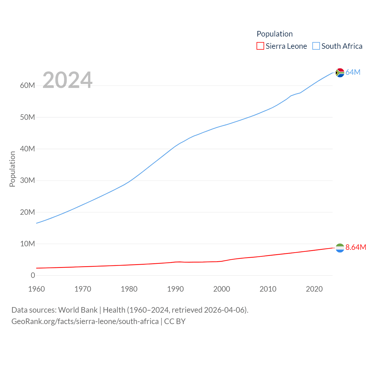 Sierra Leone has a population of 8.64M (ranked 102/197), compared with 64M in South Africa (ranked 24/197). Sierra Leone's land area is 27,869 sq mi versus 468,377 sq mi for South Africa (ranked 116th vs. 24th).