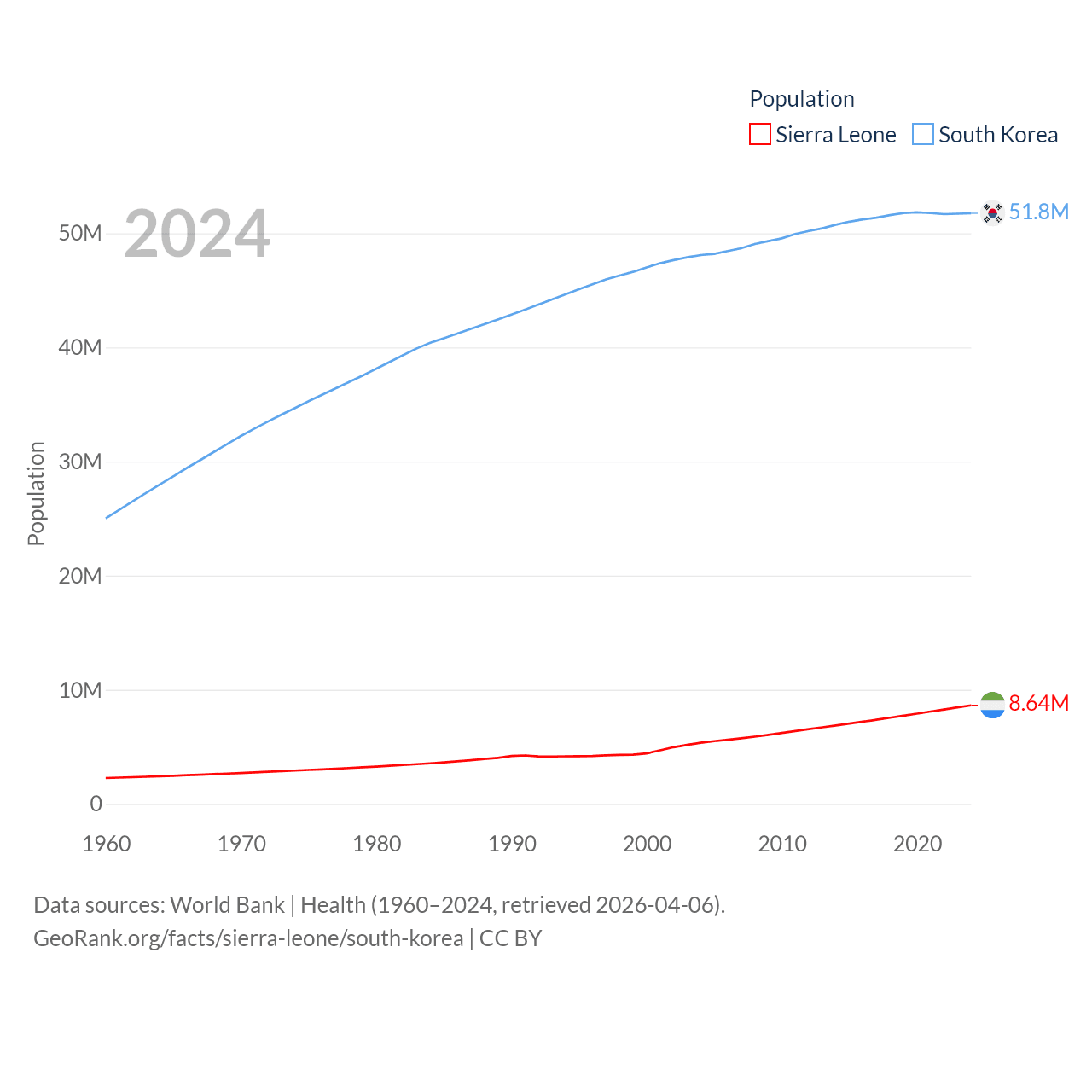 Sierra Leone has a population of 8.64M (ranked 102/197), compared with 51.8M in South Korea (ranked 29/197). Sierra Leone's land area is 27,869 sq mi versus 37,684 sq mi for South Korea (ranked 116th vs. 105th).