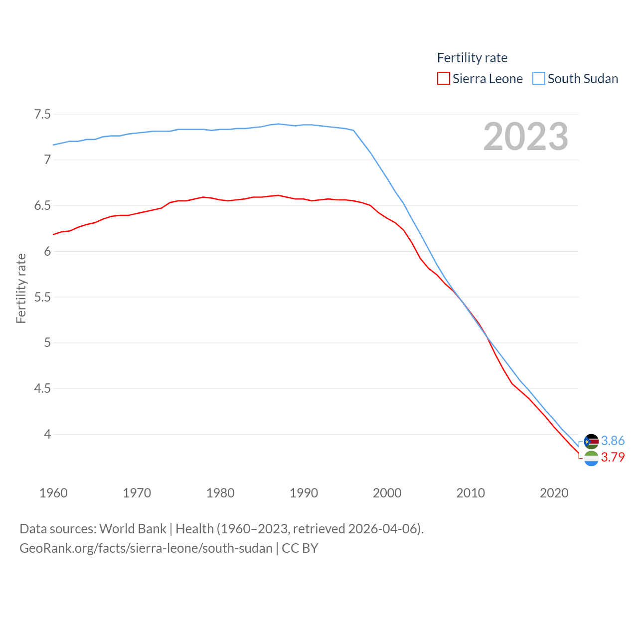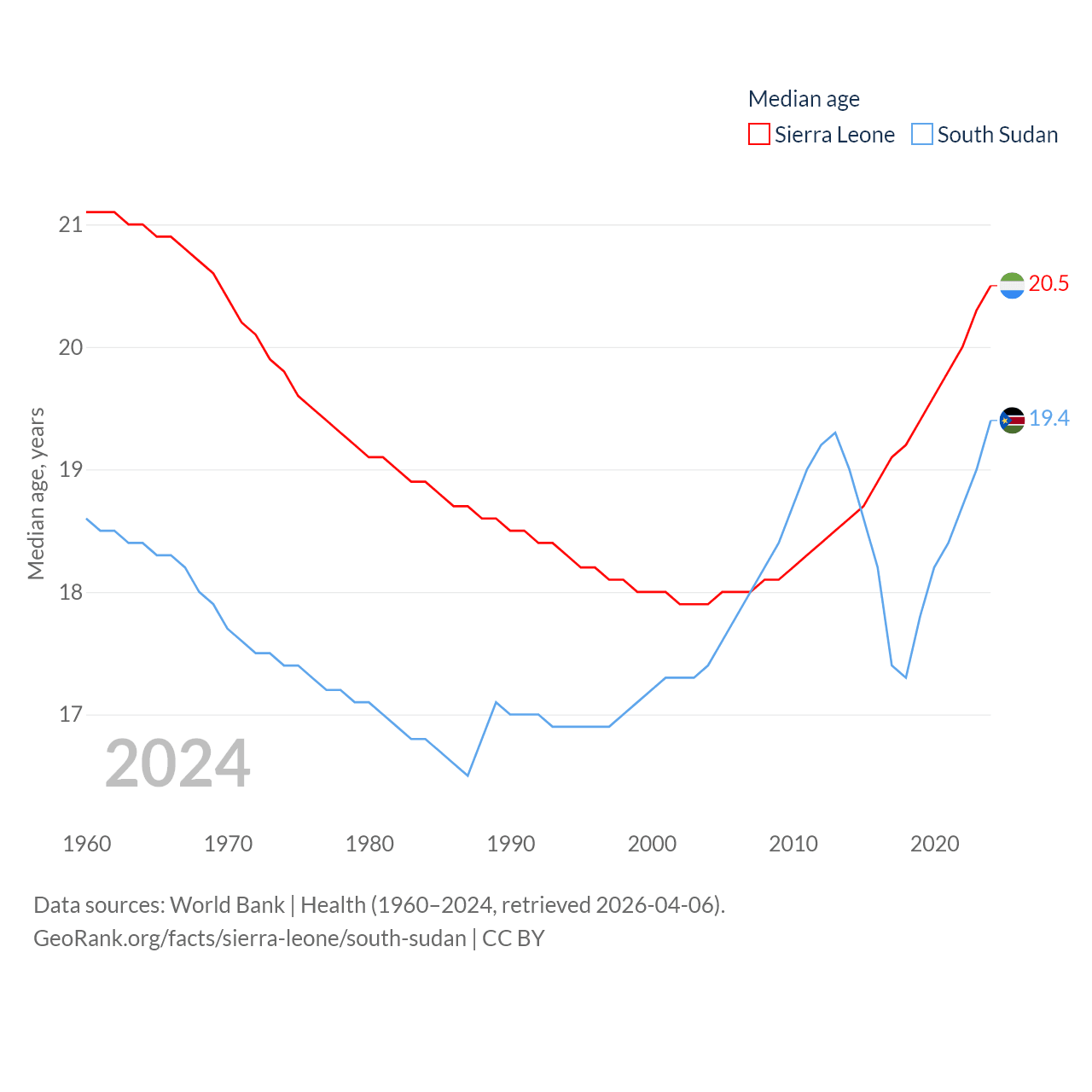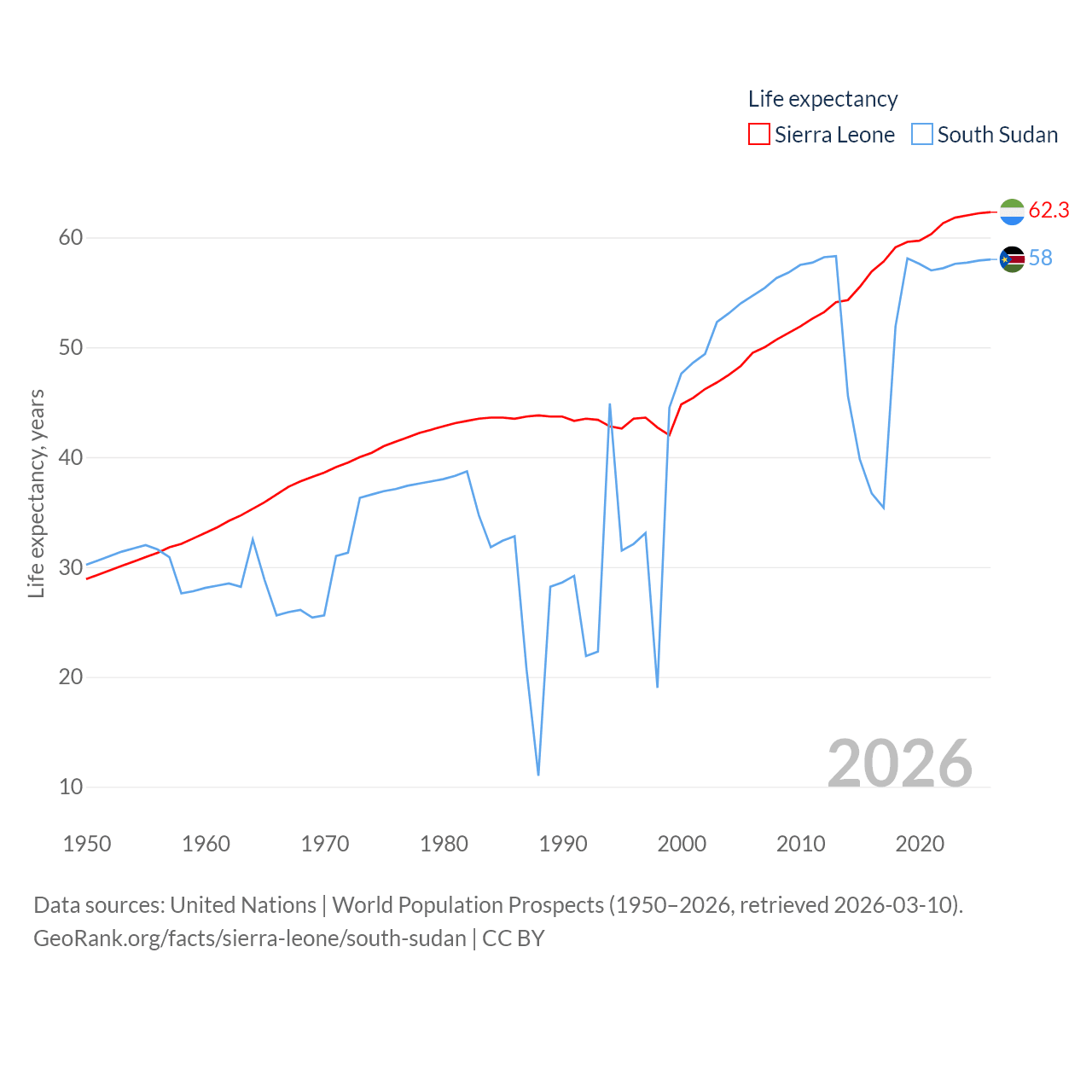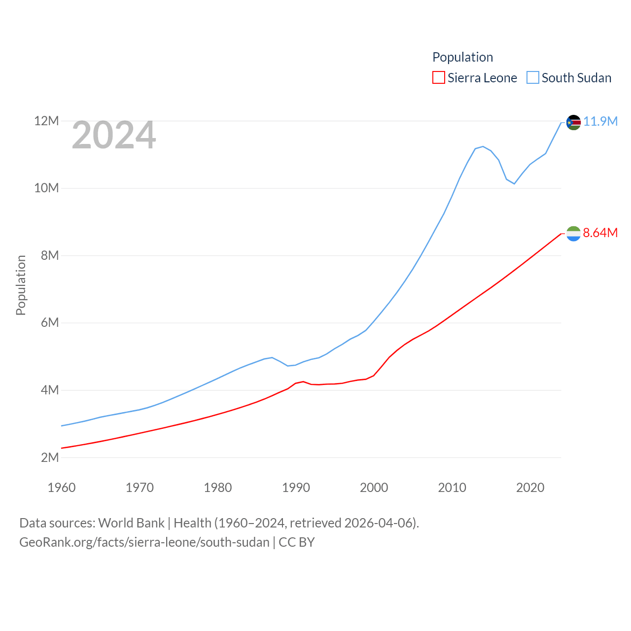 Sierra Leone has a population of 8.64M (ranked 102/197), compared with 11.9M in South Sudan (ranked 81/197). Sierra Leone's land area is 27,869 sq mi versus 243,990 sq mi for South Sudan (ranked 116th vs. 41st).