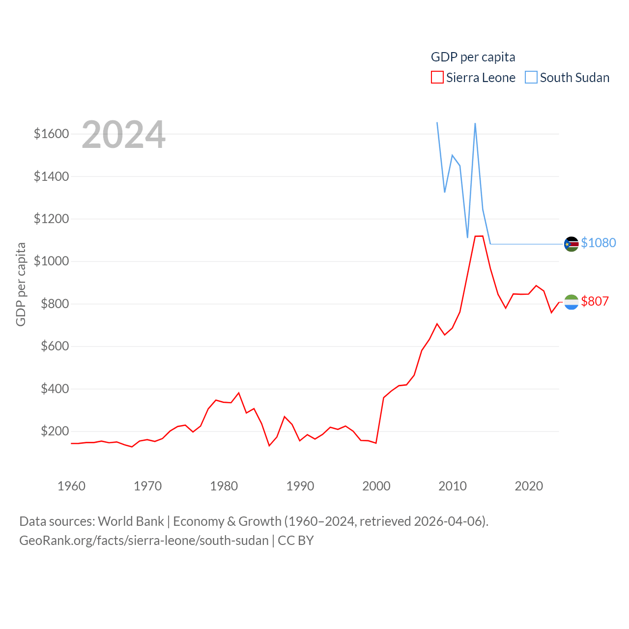 By GDP, Sierra Leone ranks 160/197 ($6.97B) and South Sudan ranks 149/197 ($12B). By GDP per capita, Sierra Leone ranks 186/197 ($807), while South Sudan ranks 175/197 ($1,080).