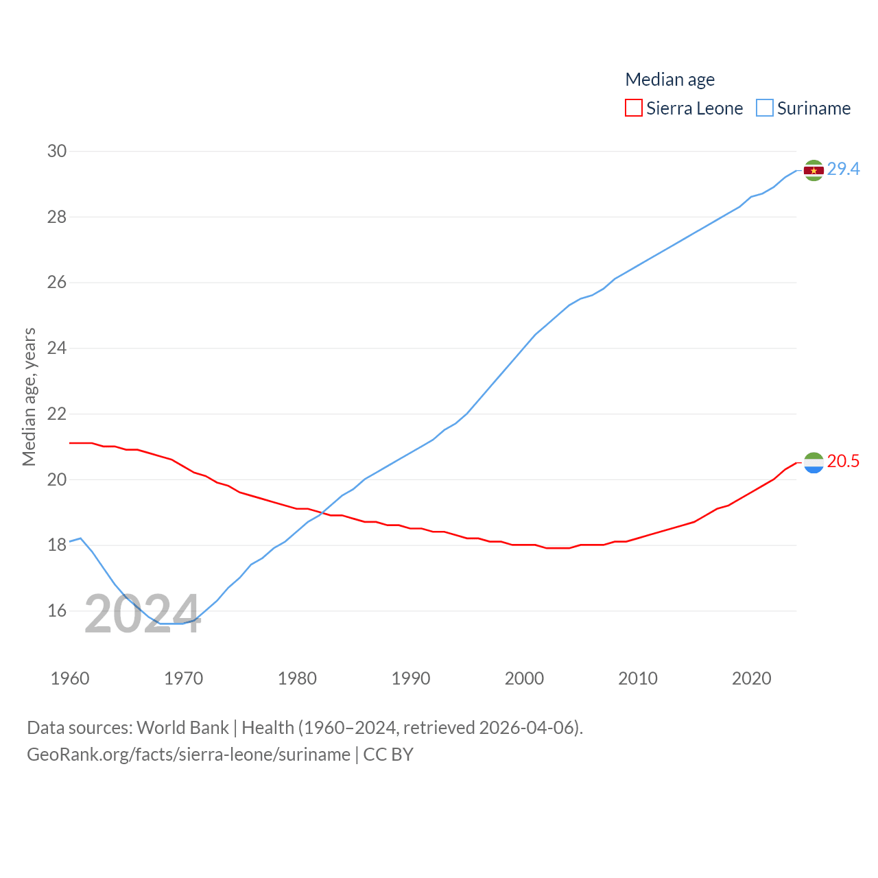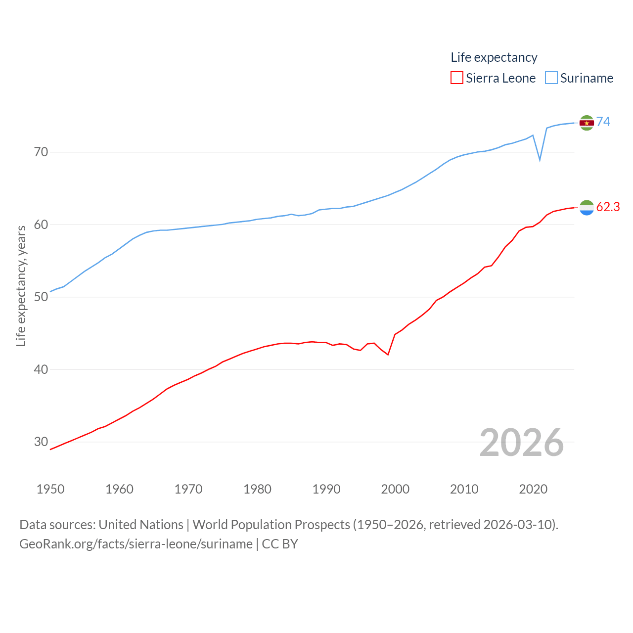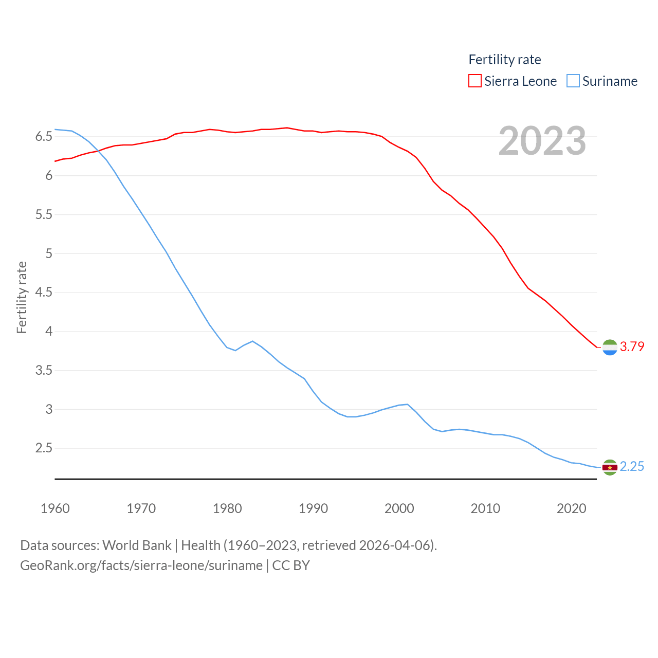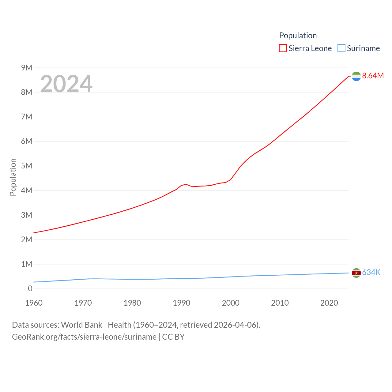 Sierra Leone has a population of 8.64M (ranked 102/197), compared with 634K in Suriname (ranked 165/197). Sierra Leone's land area is 27,869 sq mi versus 61,972 sq mi for Suriname (ranked 116th vs. 90th).