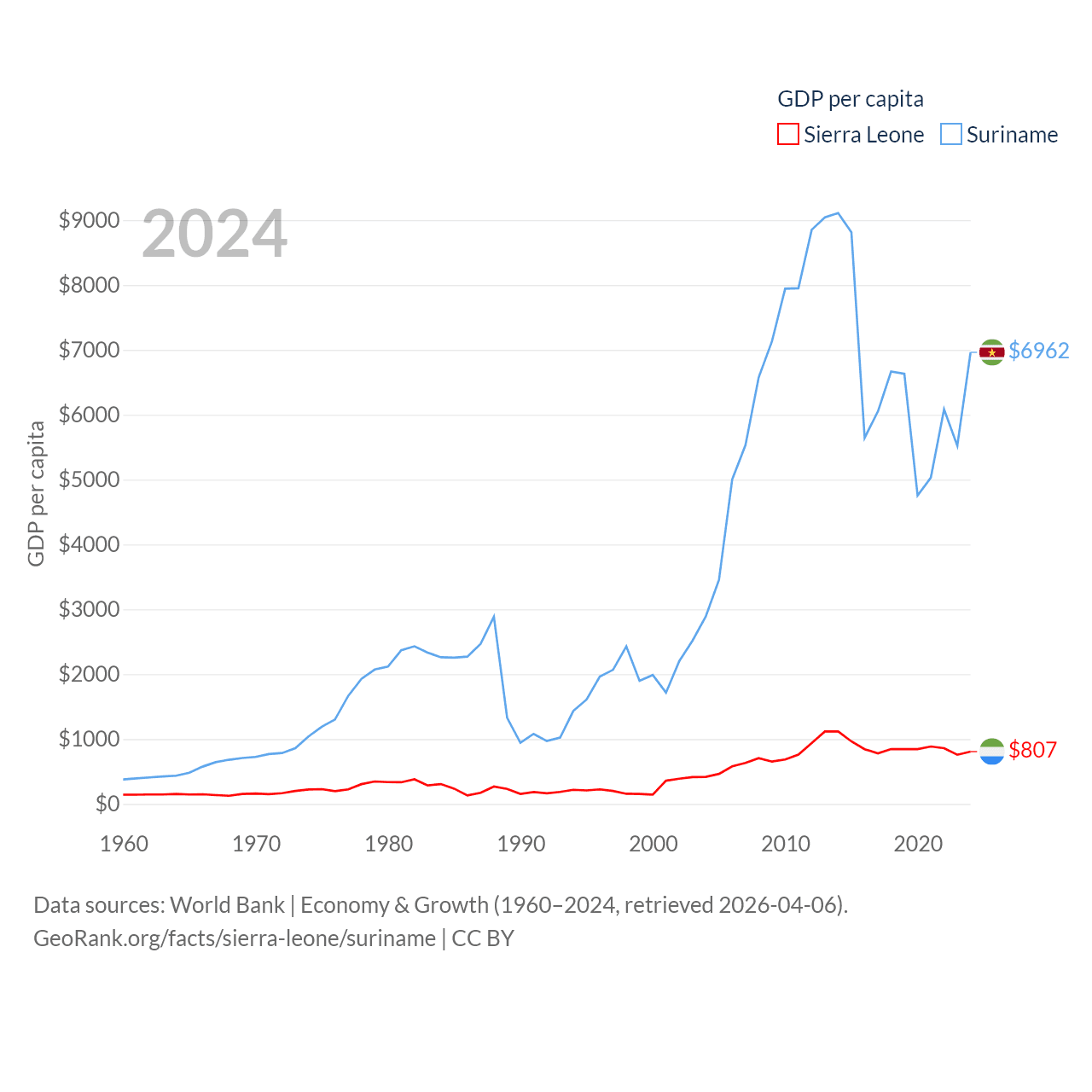 By GDP, Sierra Leone ranks 160/197 ($6.97B) and Suriname ranks 164/197 ($4.42B). By GDP per capita, Sierra Leone ranks 186/197 ($807), while Suriname ranks 102/197 ($6,962).