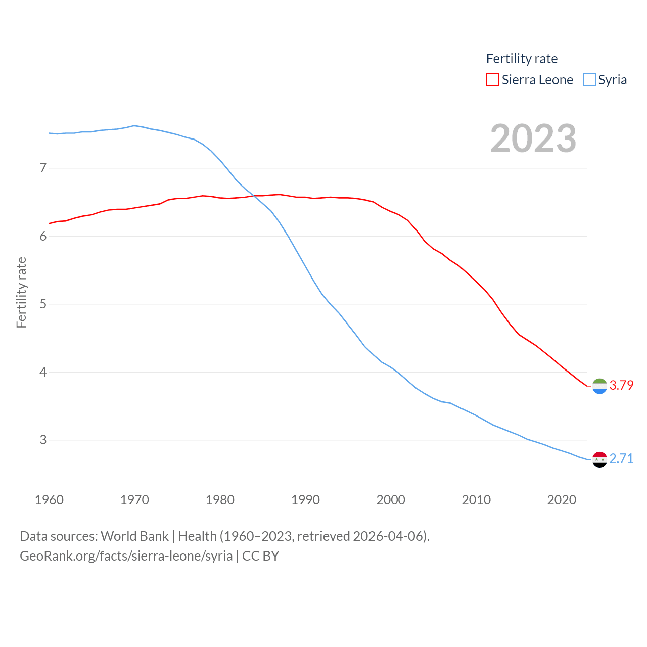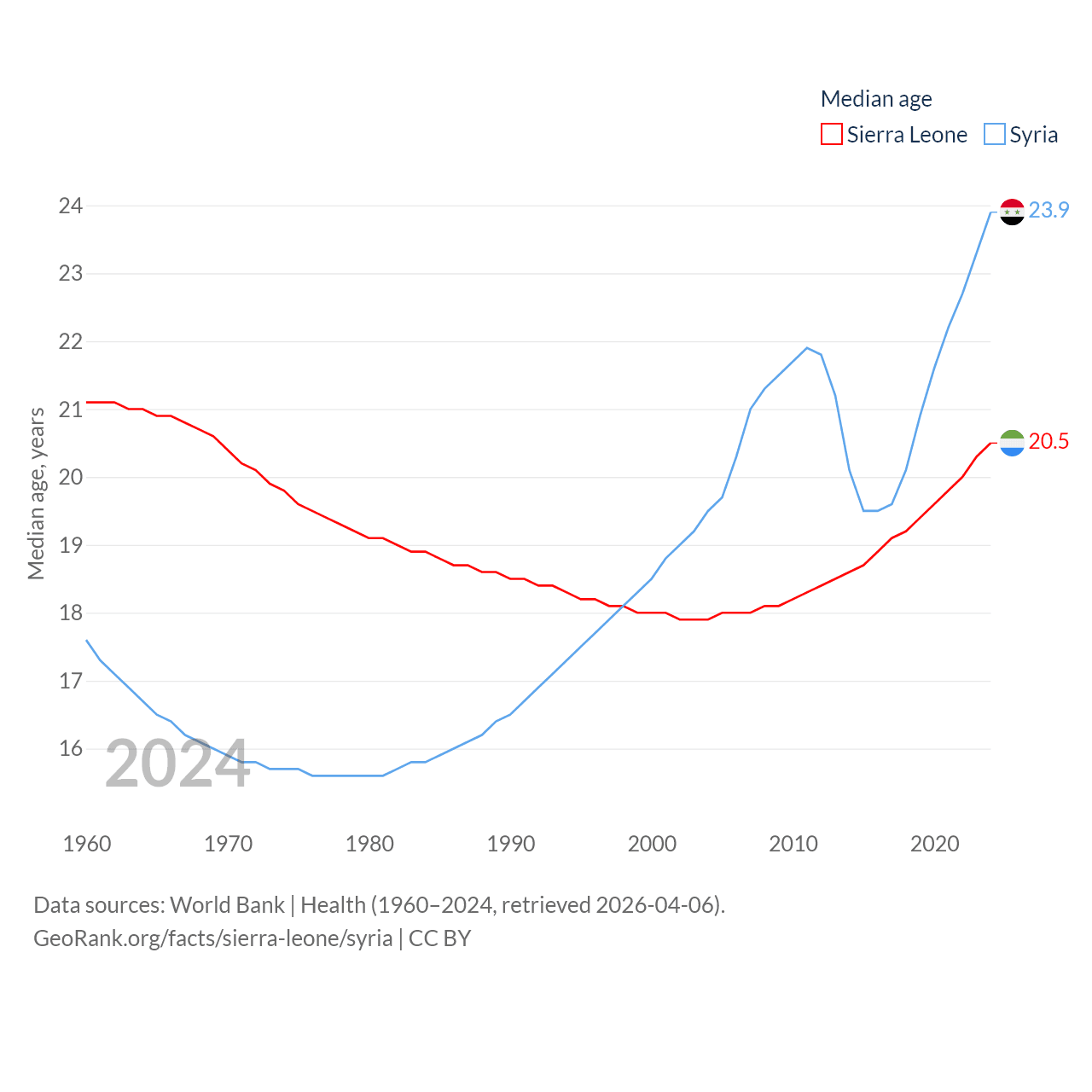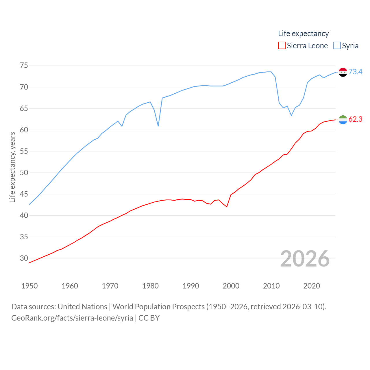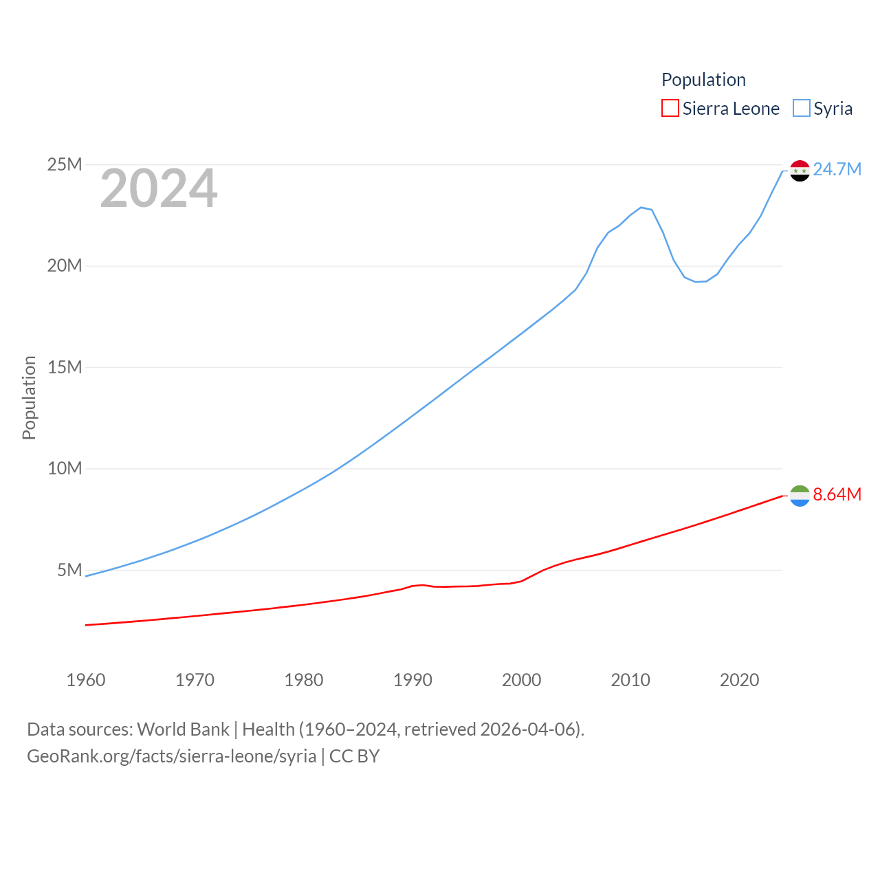 Sierra Leone has a population of 8.64M (ranked 102/197), compared with 24.7M in Syria (ranked 57/197). Sierra Leone's land area is 27,869 sq mi versus 70,900 sq mi for Syria (ranked 116th vs. 87th).