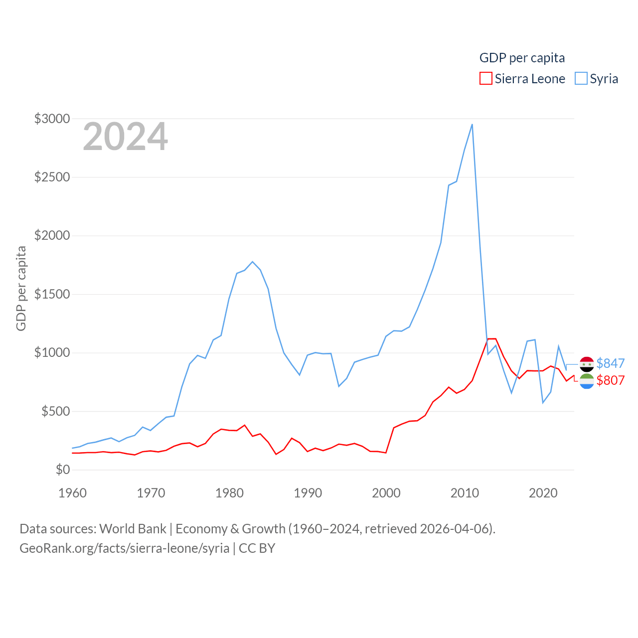 By GDP, Sierra Leone ranks 160/197 ($6.97B) and Syria ranks 129/197 ($20B). By GDP per capita, Sierra Leone ranks 186/197 ($807), while Syria ranks 185/197 ($847).