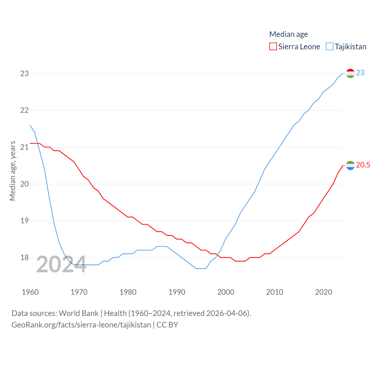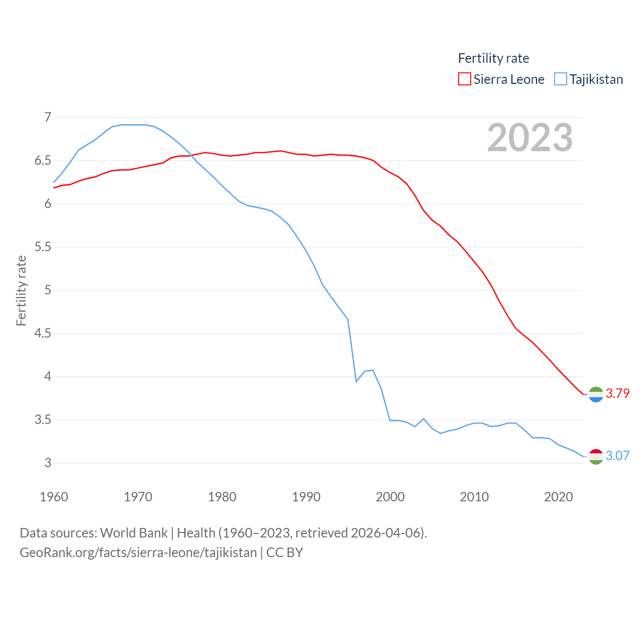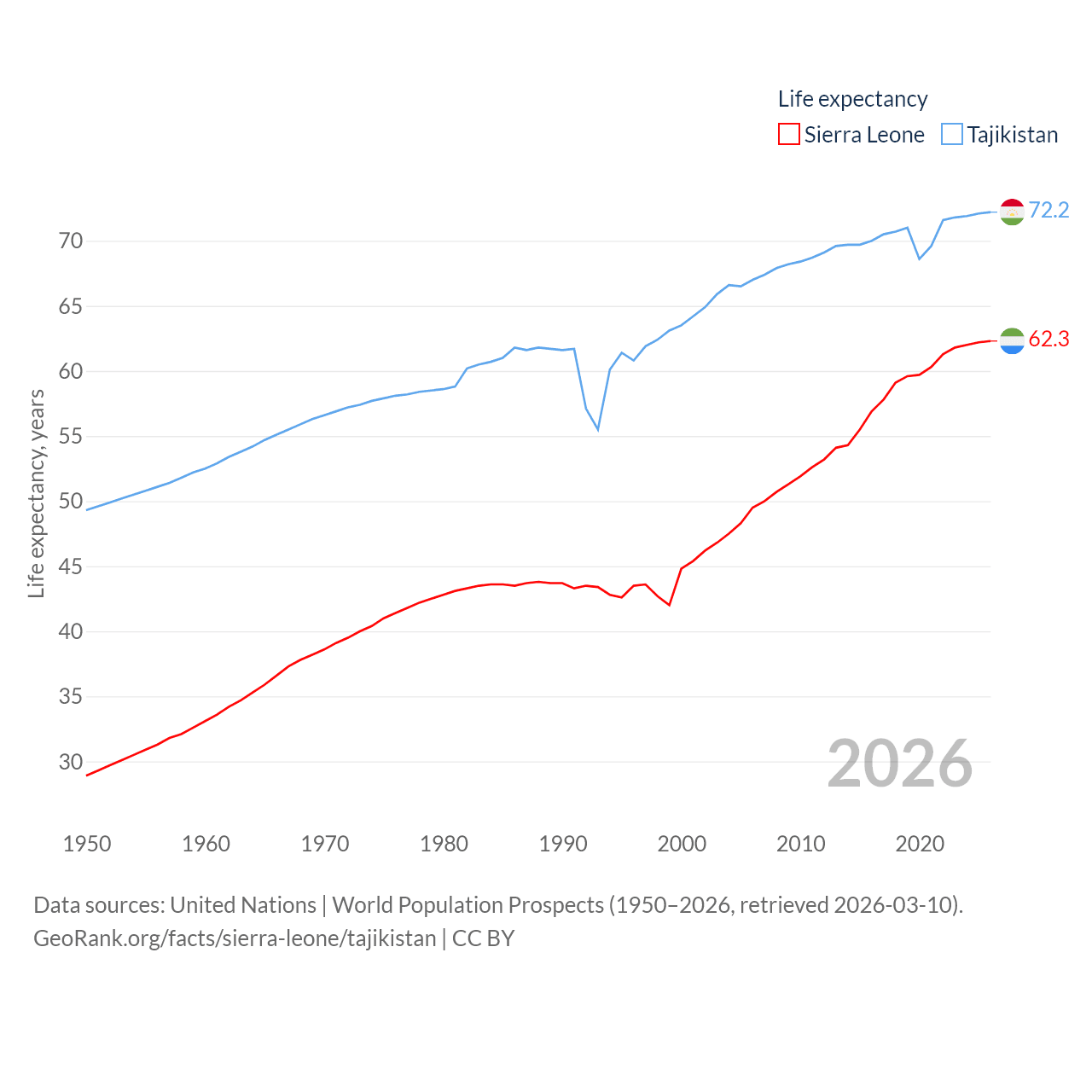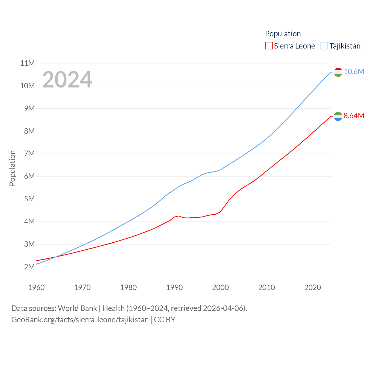 Sierra Leone has a population of 8.64M (ranked 102/197), compared with 10.6M in Tajikistan (ranked 91/197). Sierra Leone's land area is 27,869 sq mi versus 53,587 sq mi for Tajikistan (ranked 116th vs. 93rd).