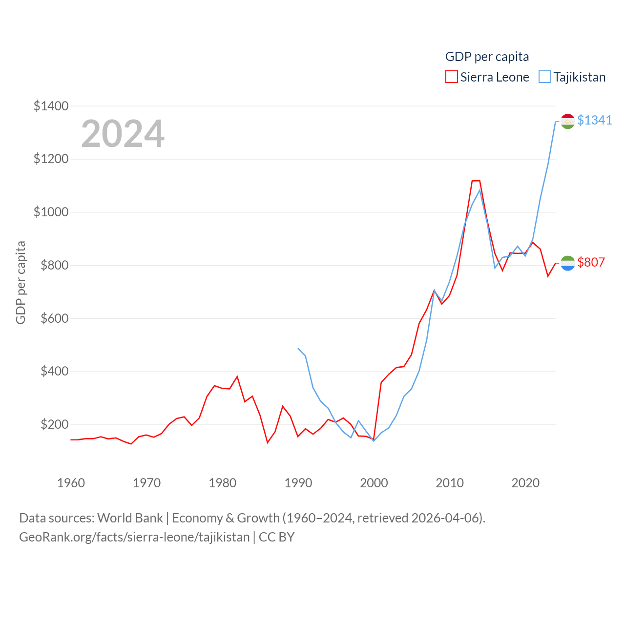 By GDP, Sierra Leone ranks 160/197 ($6.97B) and Tajikistan ranks 145/197 ($14.2B). By GDP per capita, Sierra Leone ranks 186/197 ($807), while Tajikistan ranks 166/197 ($1,341).
