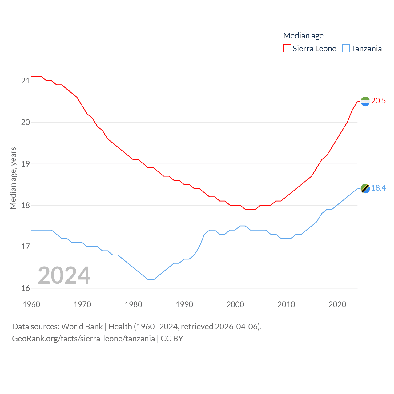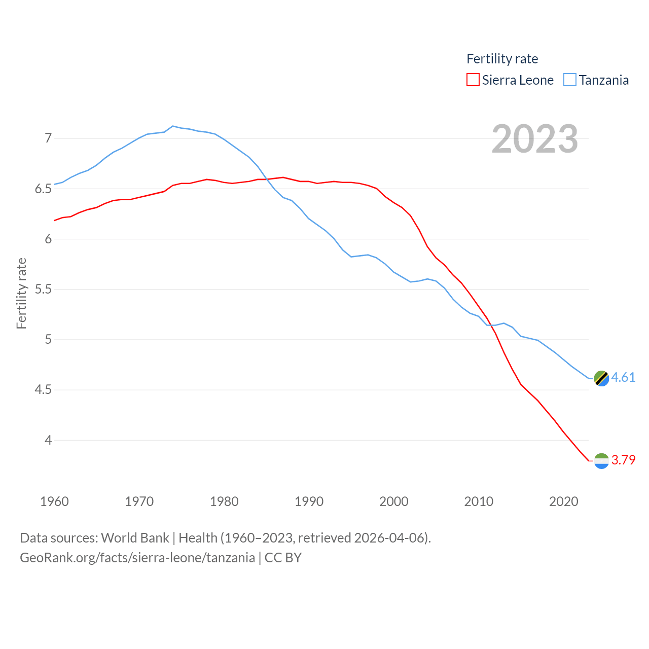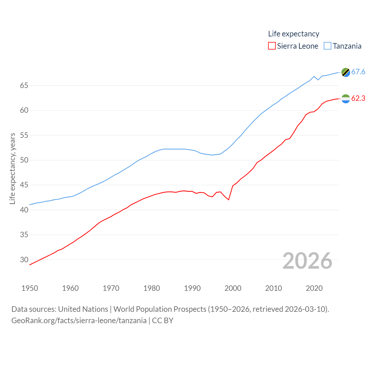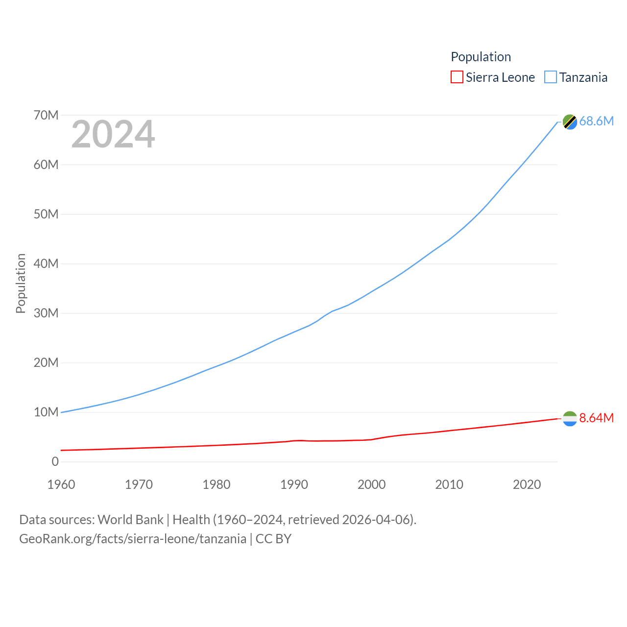 Sierra Leone has a population of 8.64M (ranked 102/197), compared with 68.6M in Tanzania (ranked 22/197). Sierra Leone's land area is 27,869 sq mi versus 342,009 sq mi for Tanzania (ranked 116th vs. 31st).
