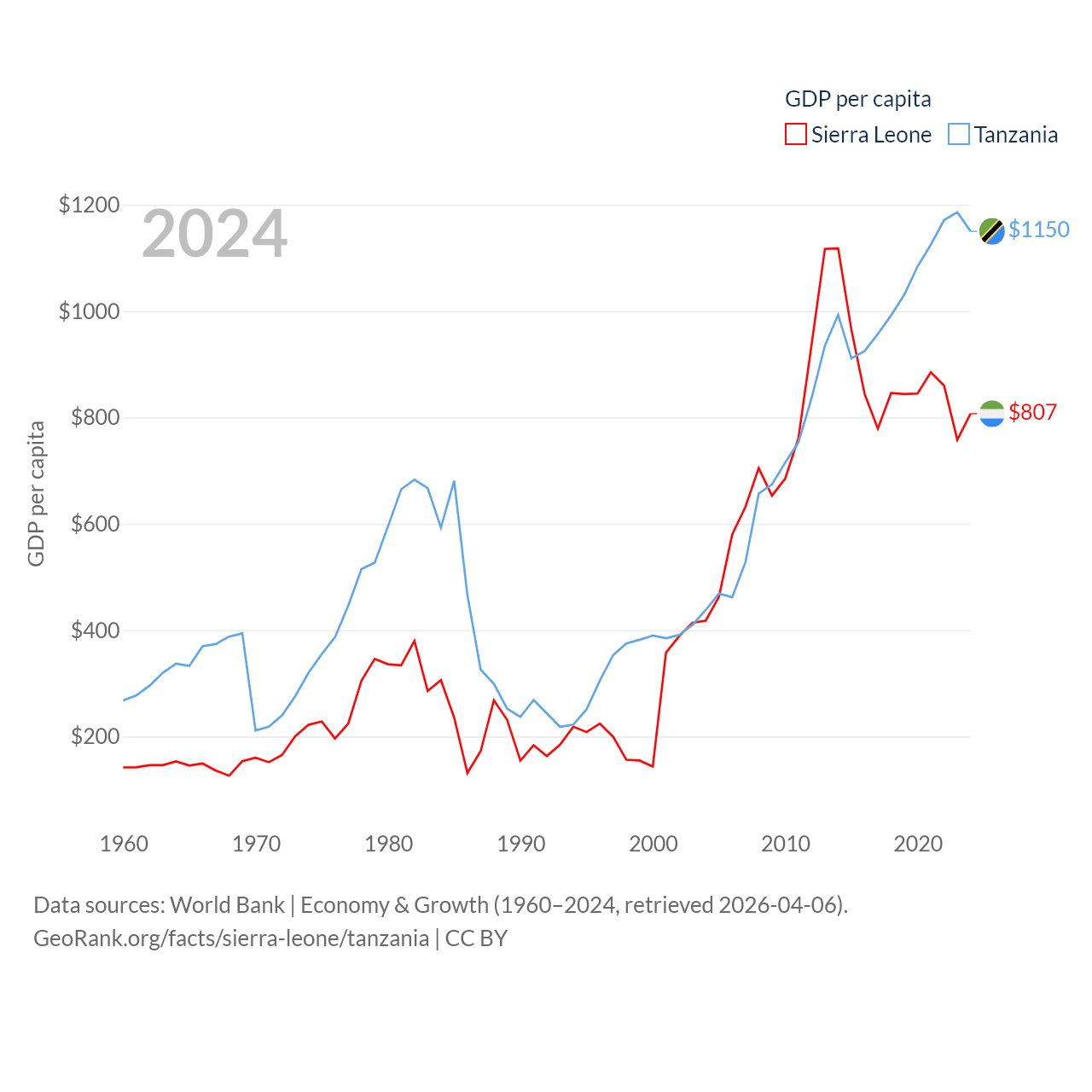 By GDP, Sierra Leone ranks 160/197 ($6.97B) and Tanzania ranks 82/197 ($78.8B). By GDP per capita, Sierra Leone ranks 186/197 ($807), while Tanzania ranks 170/197 ($1,150).