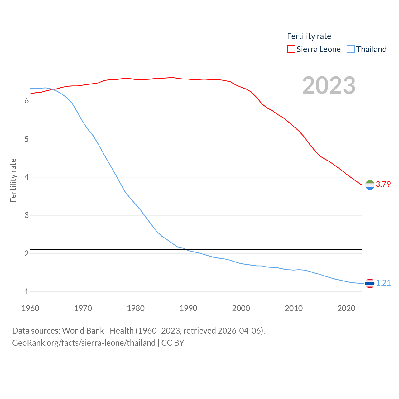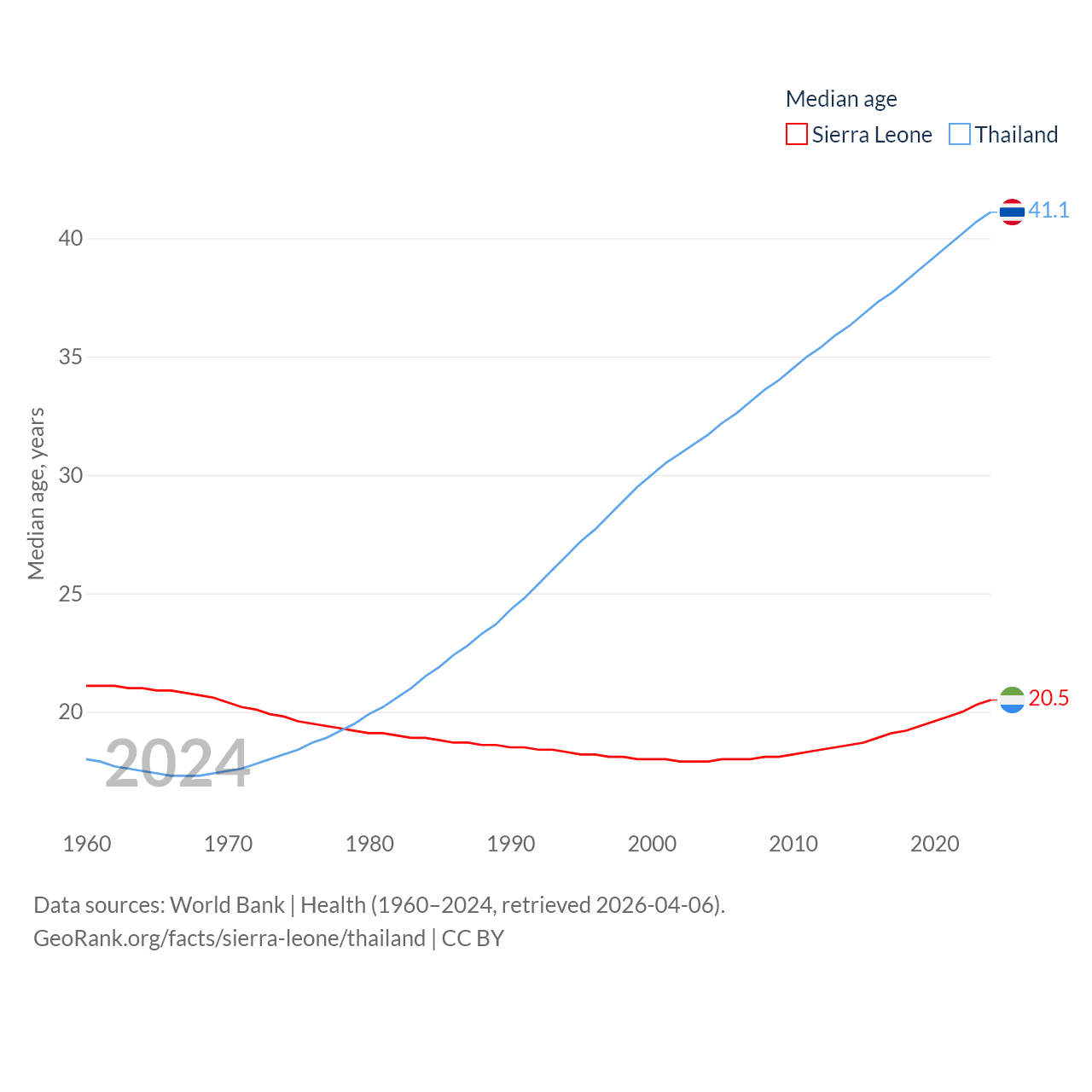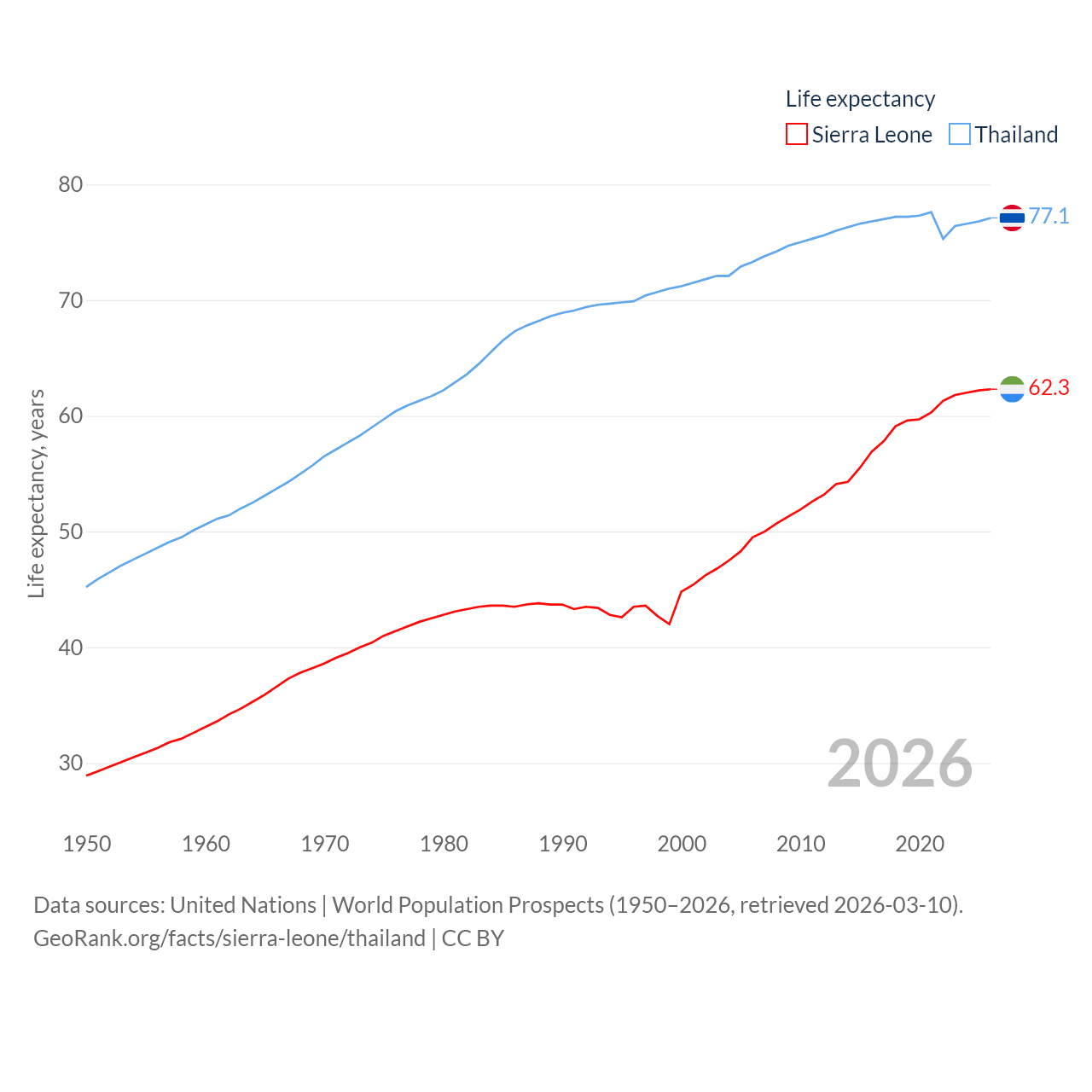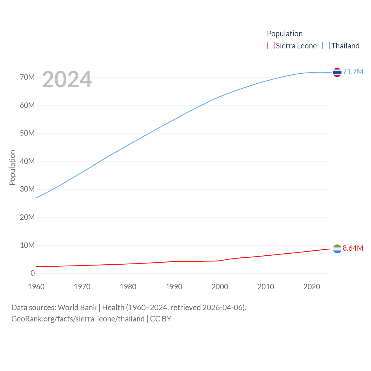 Sierra Leone has a population of 8.64M (ranked 102/197), compared with 71.7M in Thailand (ranked 20/197). Sierra Leone's land area is 27,869 sq mi versus 197,256 sq mi for Thailand (ranked 116th vs. 50th).