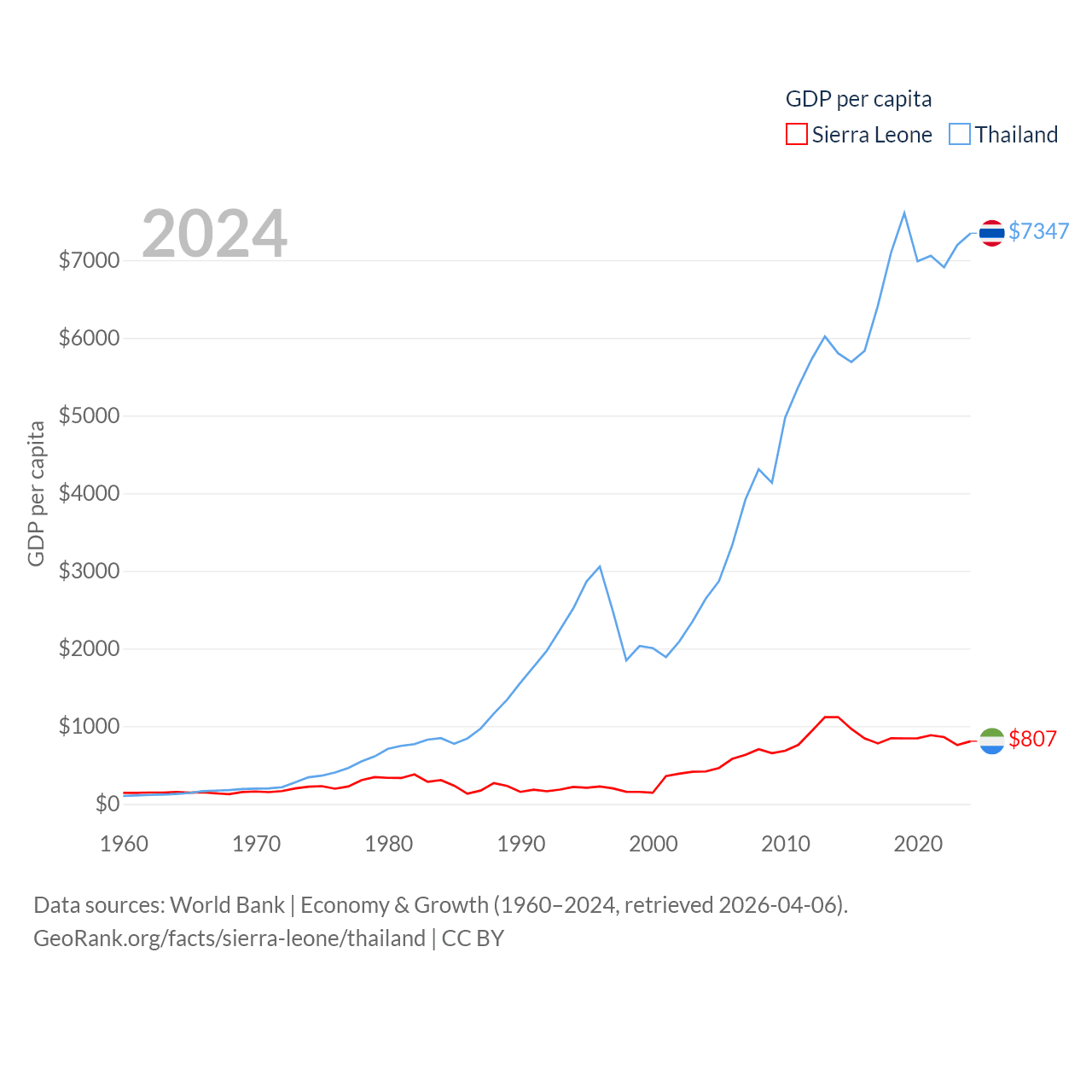 By GDP, Sierra Leone ranks 160/197 ($6.97B) and Thailand ranks 31/197 ($527B). By GDP per capita, Sierra Leone ranks 186/197 ($807), while Thailand ranks 100/197 ($7,347).