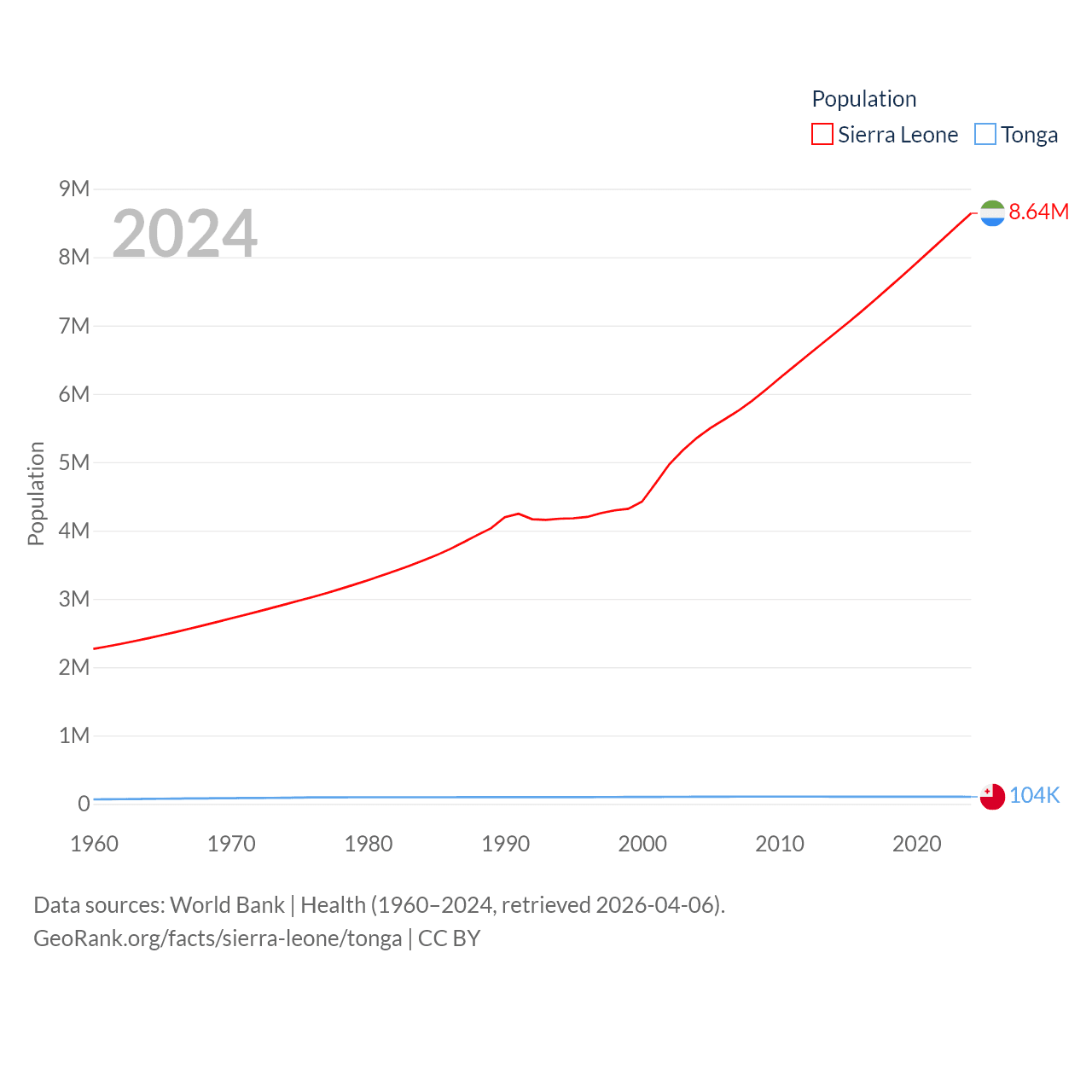 Sierra Leone has a population of 8.64M (ranked 102/197), compared with 104K in Tonga (ranked 183/197). Sierra Leone's land area is 27,869 sq mi versus 278 sq mi for Tonga (ranked 116th vs. 176th).