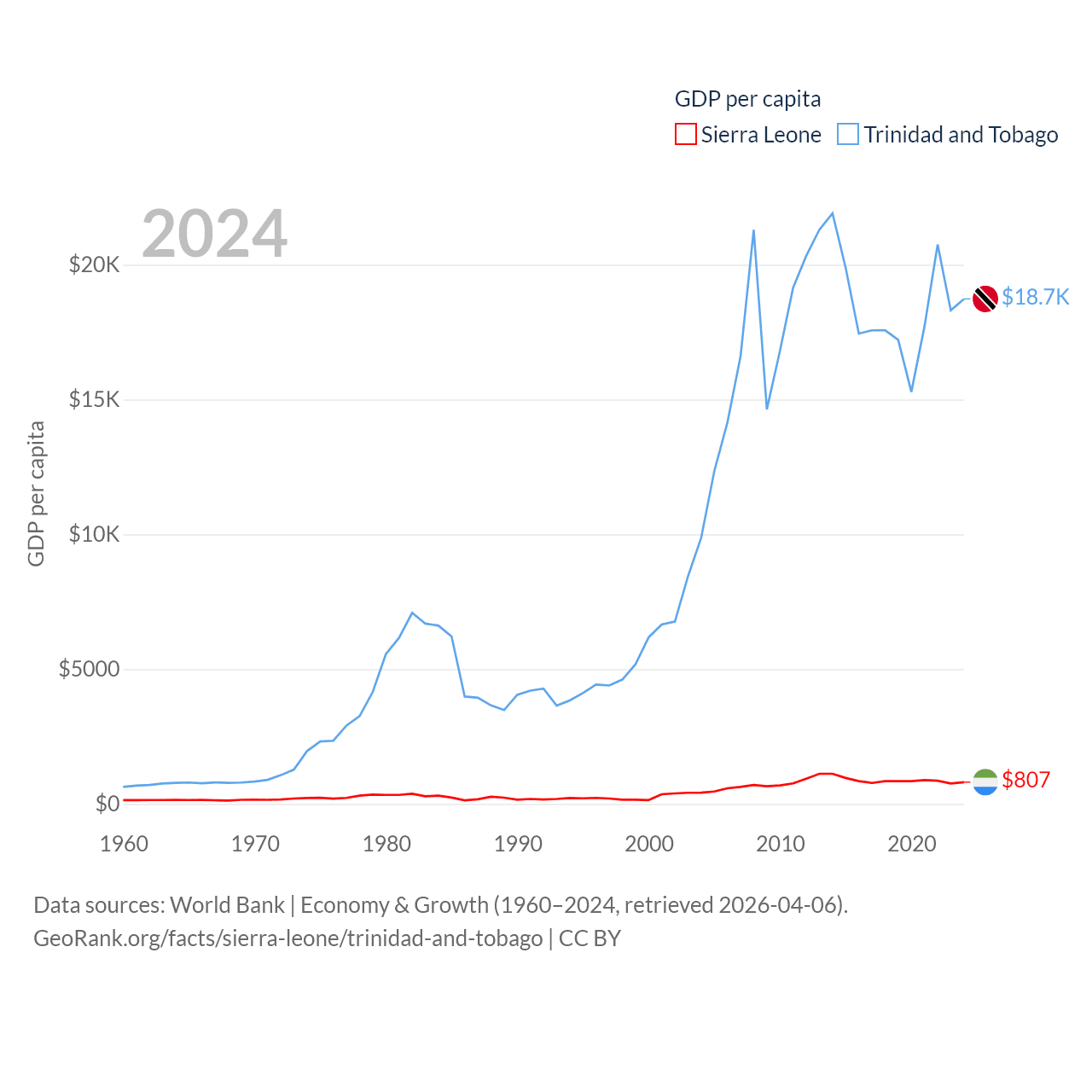 By GDP, Sierra Leone ranks 160/197 ($6.97B) and Trinidad and Tobago ranks 115/197 ($25.6B). By GDP per capita, Sierra Leone ranks 186/197 ($807), while Trinidad and Tobago ranks 61/197 ($18,733).