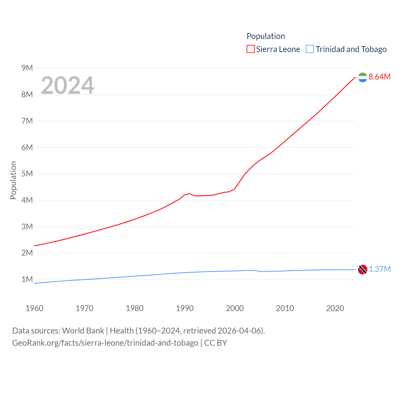 Sierra Leone has a population of 8.64M (ranked 102/197), compared with 1.37M in Trinidad and Tobago (ranked 154/197). Sierra Leone's land area is 27,869 sq mi versus 1,981 sq mi for Trinidad and Tobago (ranked 116th vs. 166th).